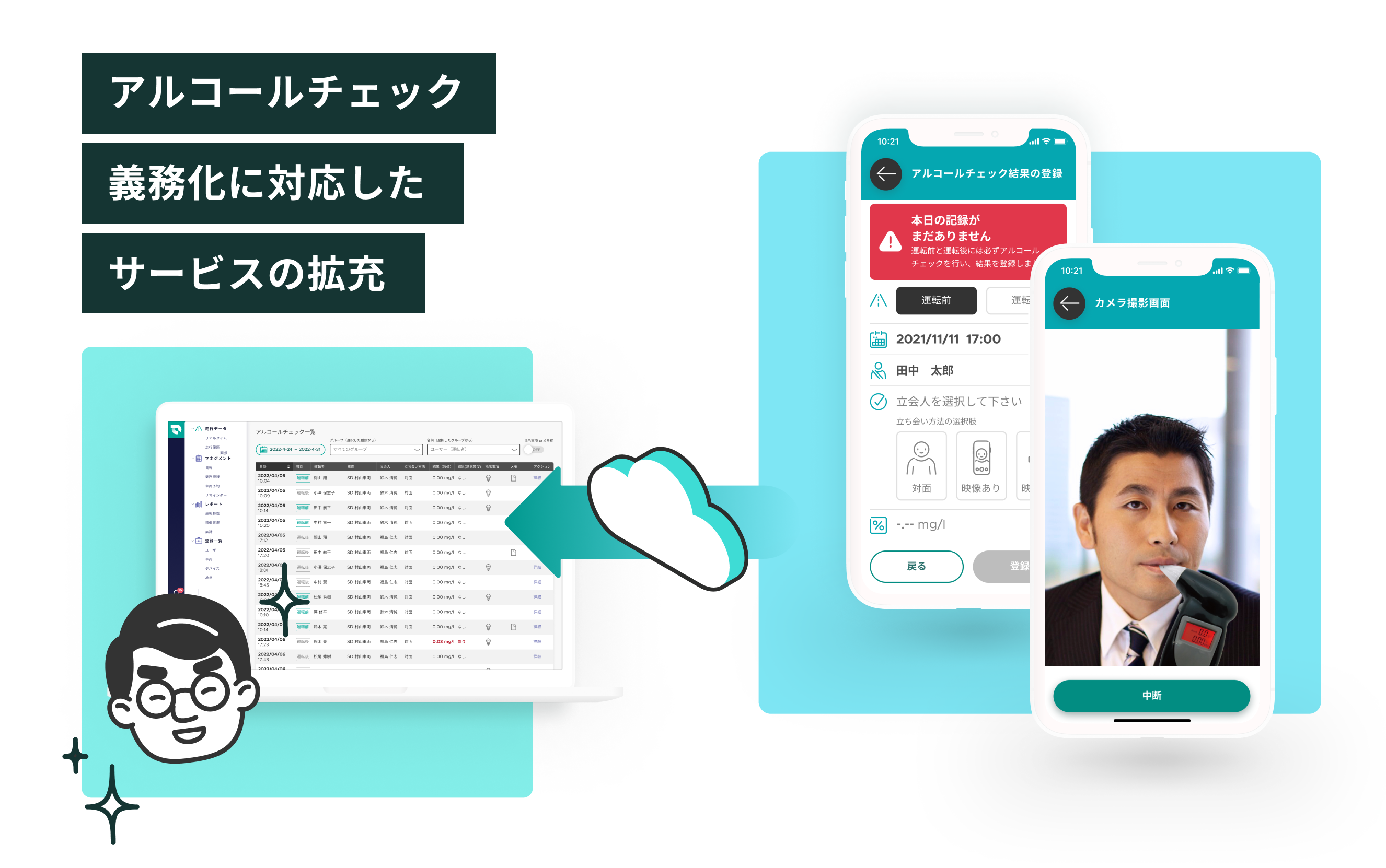 改正道路交通法施行規則の施行に伴う白ナンバー事業用車両のアルコールチェックの義務化は、2022年4月からの目視による酒気帯びの有無の確認および記録保持の開始に続き、10月からはアルコール検知器を使用した確認が求められることとなっており、対象事業所の安全運転管理者や車両管理者は、その対応に大変苦慮されているという声をいただいております。様々な業種業態や企業規模の800社以上のお客様にサービスを提供している当社は、このようなお客様の課題を解決するため、サービスを拡充いたします。