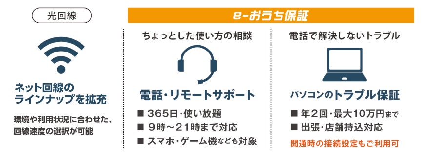 ネクスト光だけの「e-おうち保証」をセットでご利用いただくことで、パソコンやスマホ・インターネットに関するお困りごとを、365日電話・リモートで相談する事が可能です。日々の使い方の相談も、ネット詐欺が疑われる通知が届いたなど、緊急時も、いつもの窓口で相談が可能です。また、年2回のトラブル保証があり、電話で解決できないトラブルや、直接相談して解決したいお客さまのご要望には、当社スタッフが最短即日で出張、またはお近くの店舗で修理・トラブルに対応する充実のサポートとなっています。『サポート付きネット回線』にご契約いただくことでネット利用の不安を解消し、これまでバラバラに契約していた端末の延長保証等もまとめて家計の見直しにもつながります。