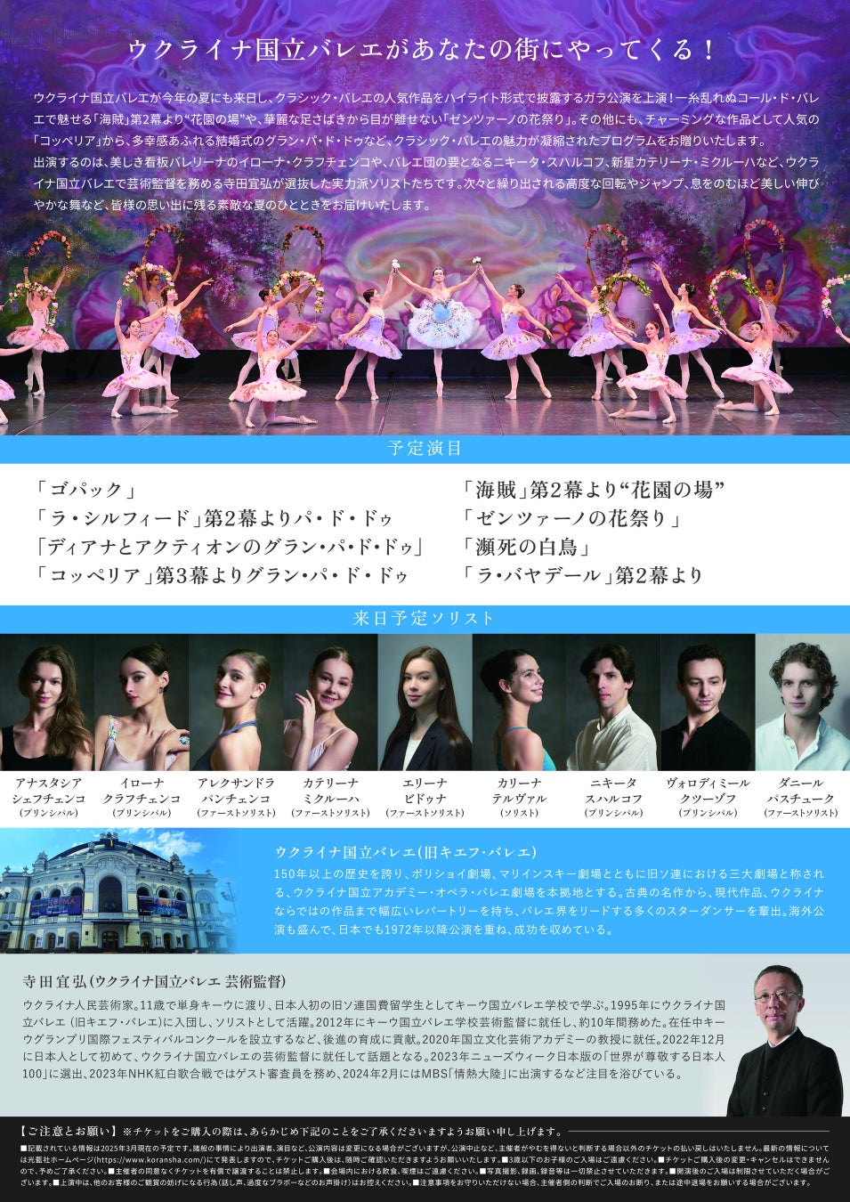 京都出身でもある寺田宜弘氏は、2022年12月に伝統ある同劇場の芸術監督に日本人として初めて就任。困難な状況が続くウクライナ国立バレエを率いて世界的に活躍をしています。寺田芸術監督の貴重なお話と、アナスタシア・シェフチェンコのパフォーマンスを、是非ご覧ください。