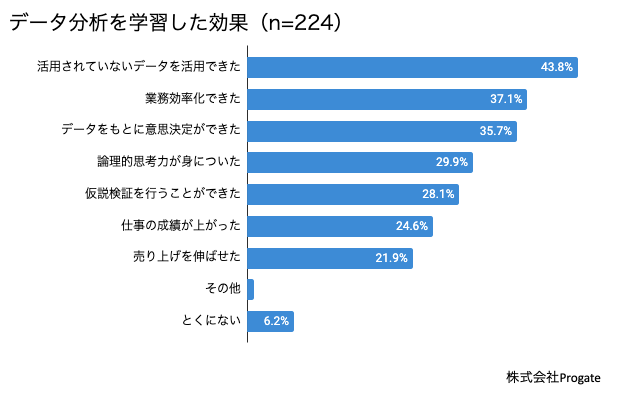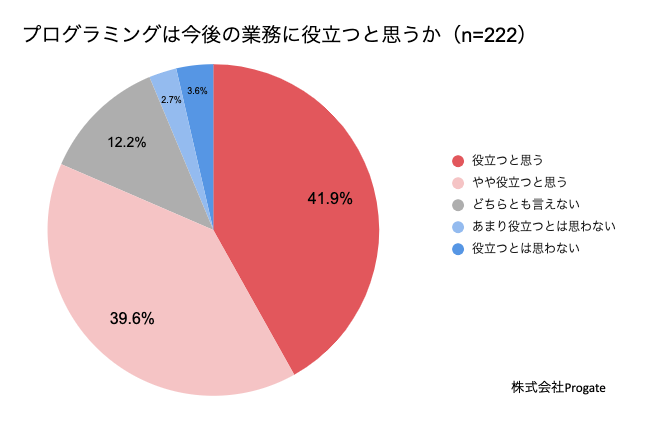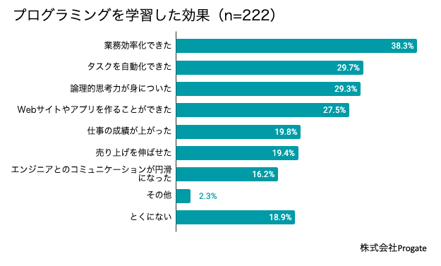| <プログラミング> 「定型の書類作成やデータ抽出をほぼ自動化できた。効率化には、なくてはならないものとなった(52歳・男性)」 「一つ一つのファイルを開いて日付を入れて印刷していた物を、ボタン一つで同じフォルダ内にあるファイルを、自動で日付を入れ、印刷をかける事が出来る様になった事。(43歳・女性)」 「システム思考ができるようになった。日々のちょっとした業務が効率化された業務アプリケーションを作れるようになった(50歳・男性)」 <データ分析> 「データ分析により売上状況の把握や市場比較などができ、既存品の新規市場参入企画を実現できた(32歳・男性)」 「データから、読み取れる傾向を読んで対策したら、売上が上がった(26歳・男性)」 「理論的に根拠を伝えられ、説得力が増して信頼が増した(40歳・女性)」 |