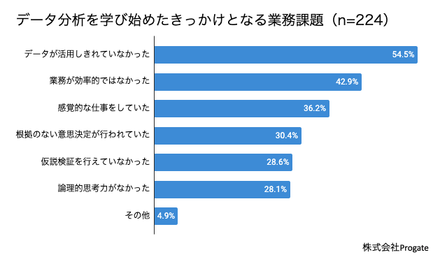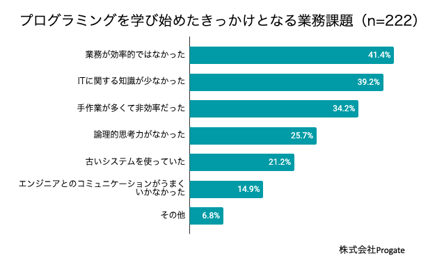まず、学び始めたきっかけとなる業務課題について聞いたところ、プログラミング学習者では「業務が効率的ではなかった」が最も多く、データ分析学習者では「データが活用しきれていなかった」が最も多い結果となった。