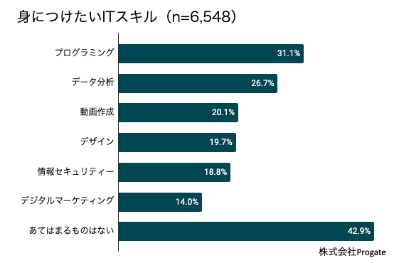全国の20歳〜65歳の会社員6,548人を対象に、基本的なPC操作を除いたITスキルを並べ、その中から身につけたいITスキルを聞いたところ、「プログラミング」が31.1%、「データ分析」が26.7%、「動画作成」が20.1%という結果だった。