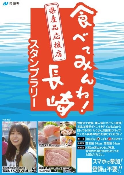 長崎県(本庁:長崎県長崎市、知事:大石賢吾)は、首都圏・関西圏を中心に長崎県産品を積極的に取り扱っていただいている 飲食店等を「食べてみんね!長崎県産品応援店」と認定しており、2月1日(水)~3月12日(日)の間、「応援店」と長崎県アンテナショップ「日本橋 長崎館」(東京都中央区日本橋2-1-3)、長崎県平戸市アンテナショップ「有楽町ひらど商館」(東京都千代田区有楽町2-10-1)の周遊促進を目的として、「食べてみんね!長崎県産品応援店スタンプラリー」を実施します。たくさんの応援店を巡って、たくさんの長崎の魅力を感じてください。