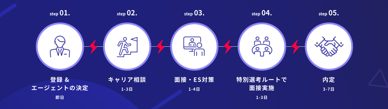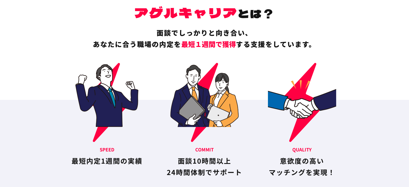 具体的には、転職サポートのスピード感が⽇本一早く、また 24 時間 365 ⽇コミットする体制があり、マッチングのクオリティにも定評がある、スピード・コミット・クオリティの⾼いサービスを提供します。
