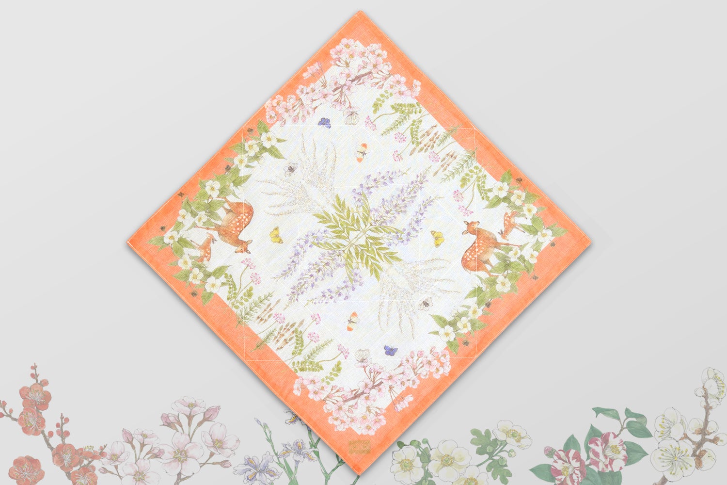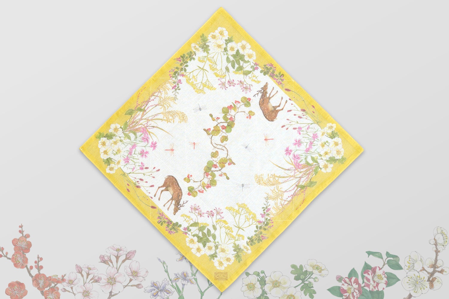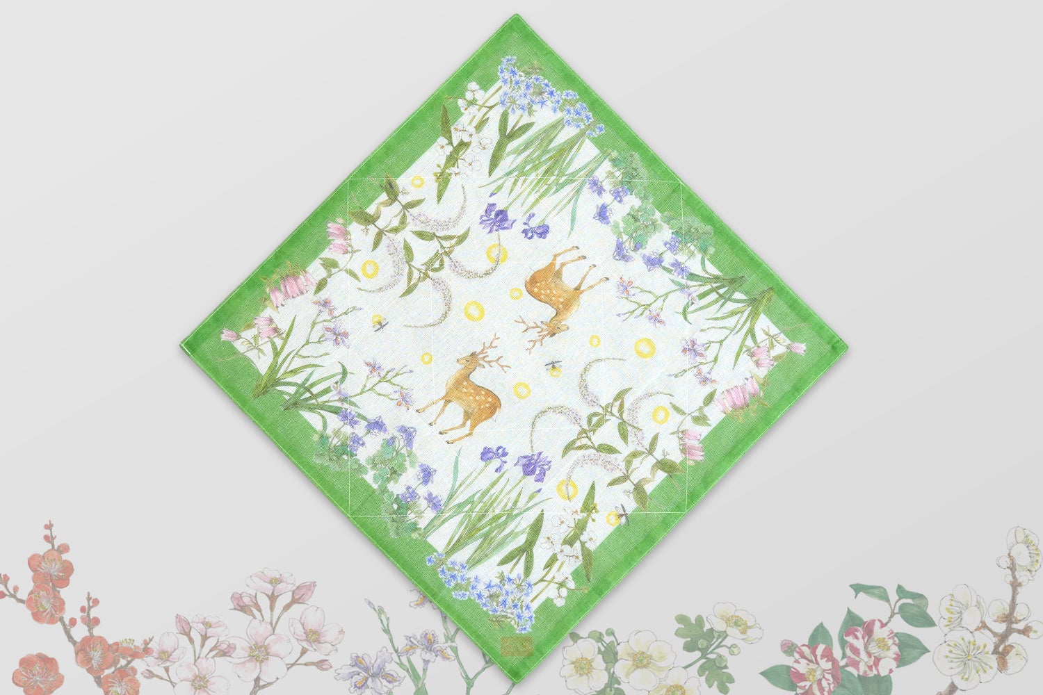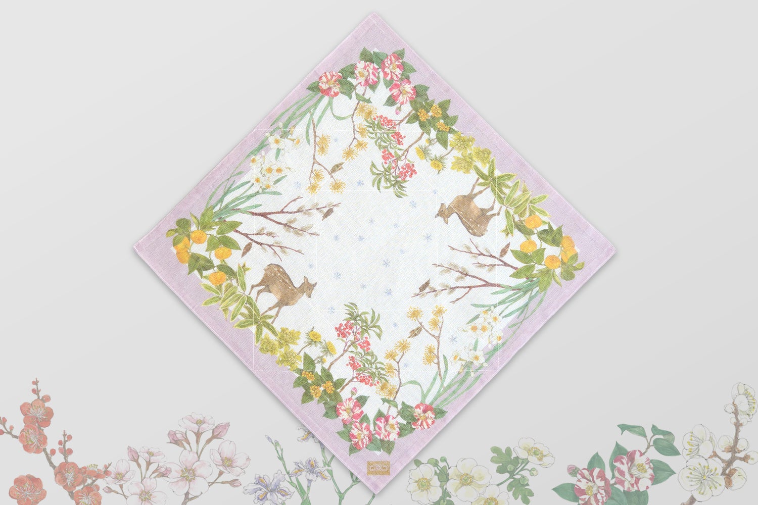 そして今回、30年分の感謝を込めて、花ふきんは「飾りたくなるほど、華やかな花ふきん」として周年を迎えます。58cm四方の大判サイズに、四季折々の花や季節にまつわる生き物、そして奈良らしく鹿の姿を描いた絵柄は、ふきんという枠を越え、まるで一枚の絵画のよう。飾る・包む・目隠しにするなど、暮らしの中にそっと咲く花のように、日常を彩ってくれる一枚が生まれました。
