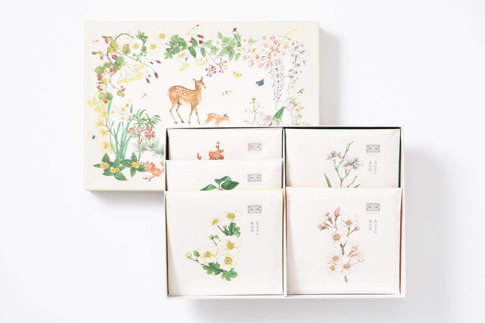30周年の特別なボックスに、限定商品5種「春・夏・秋・冬・寿」を詰め合わせました。ボックスには、ふきんにも描いた四季折々の花と親子鹿を添えています。