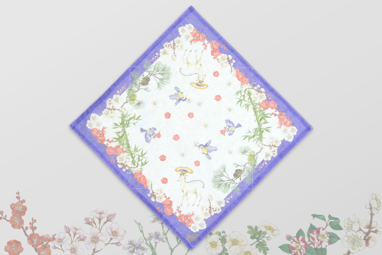慶事に相応しい花として梅、松、竹とともに、正倉院文様の一つで縁起のよい図柄として知られる「花喰鳥(はなくいどり)」と「花鹿(はなしか)」を描きました。