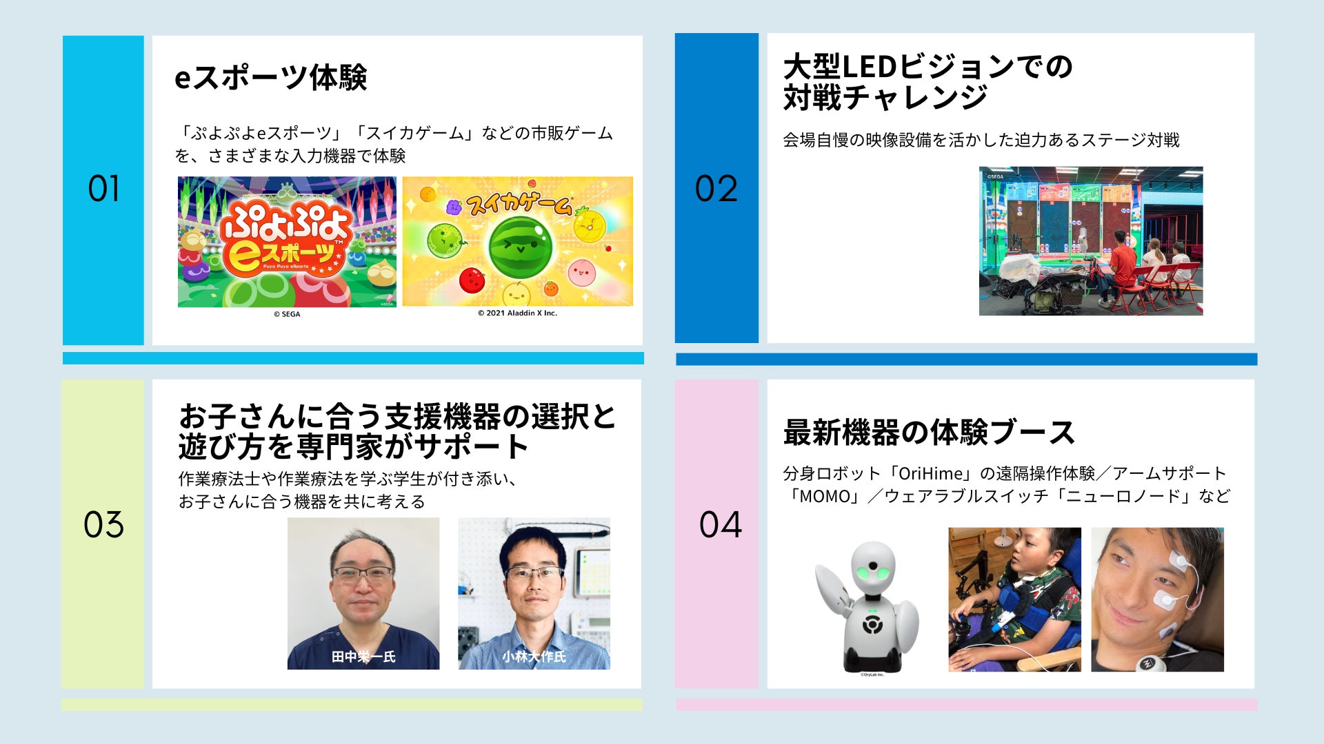 わずかな力で操作できる入力デバイスや視線入力装置などのインクルーシブ・テクノロジー(以下、「インクルーシブ・テック」)を用いて、市販のゲームを体験するイベントです。