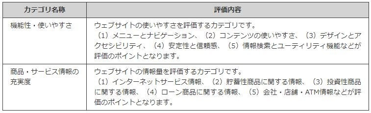 本調査では、「機能性・使いやすさ」「商品・サービス情報の充実度」の2つの切り口から設定された183の調査項目に基づいて当社のアナリストが調査を行います。主な評価内容は以下のとおりです。