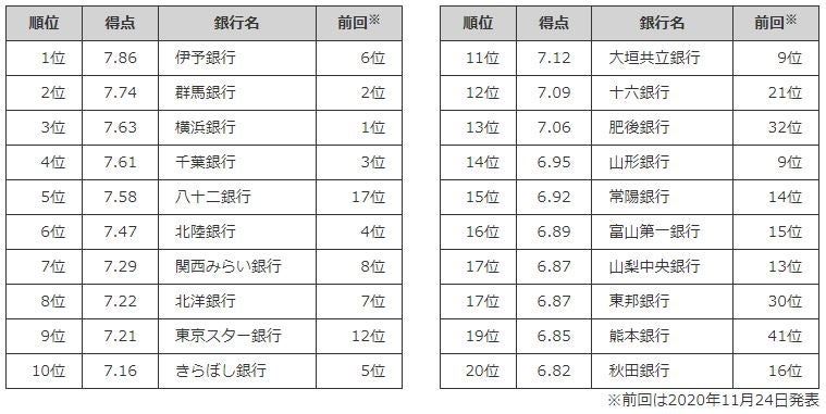「Gomez地方銀行サイトランキング2022」総合得点上位20サイトは、次のようになりました。