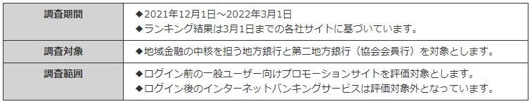 当社は、地域金融の中核を担う地方銀行・第二地方銀行のウェブサイト、とりわけ顧客とのコミュニケーションの起点となるプロモーションサイト(ログイン前の一般ユーザー向けサイト)のユーザビリティやコンテンツを評価したランキング調査を継続的に実施しており、今回で10回目の発表となります。