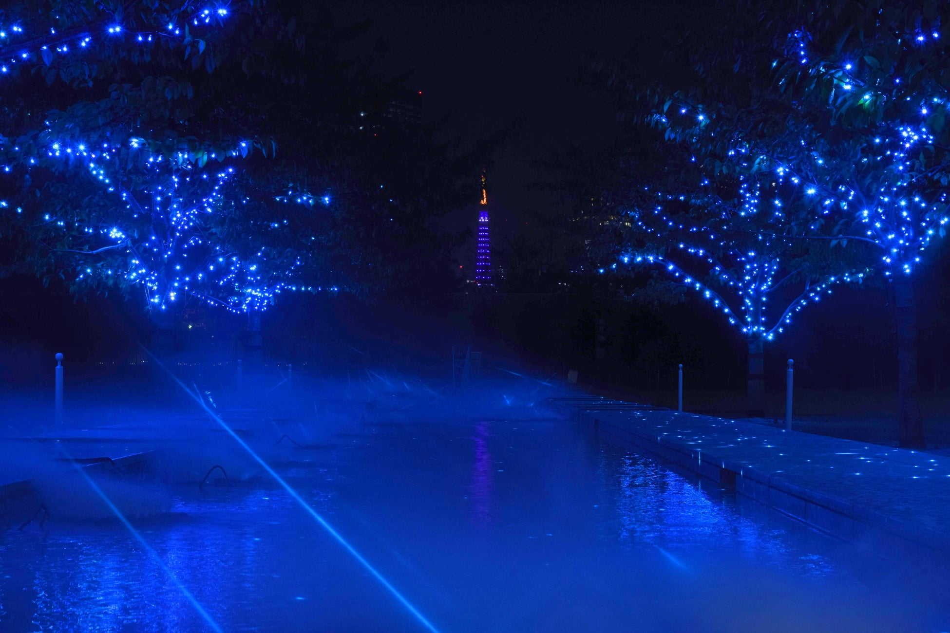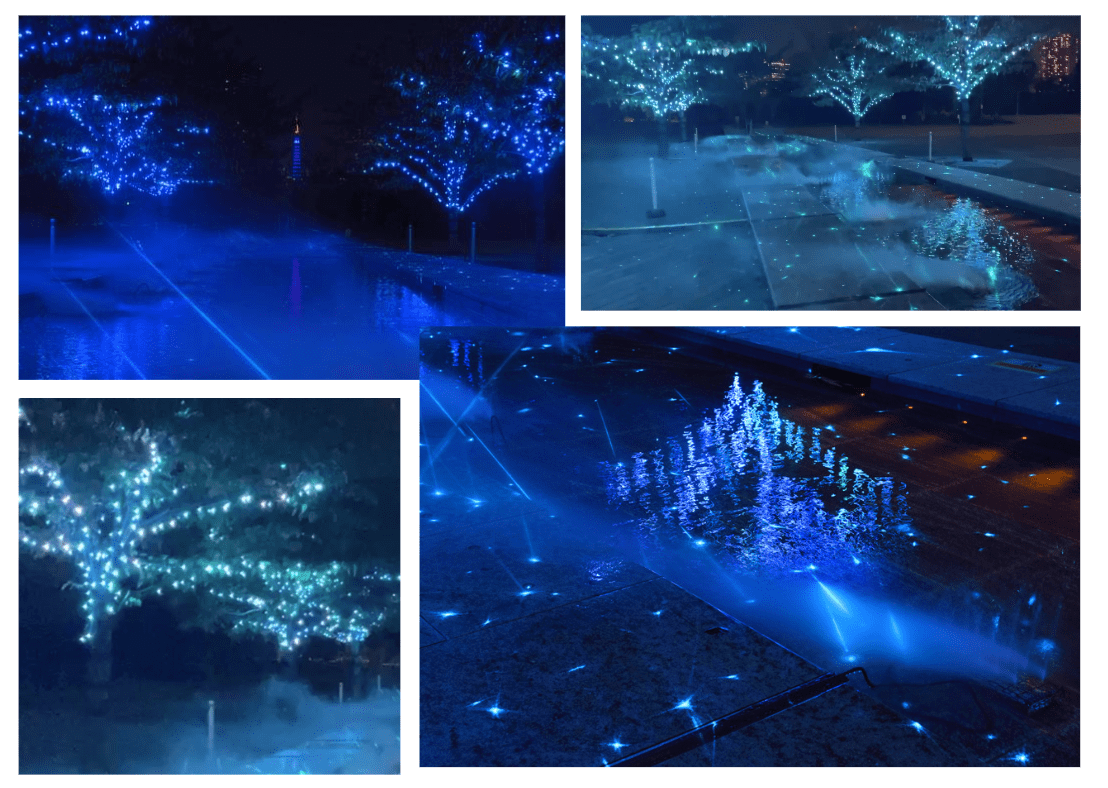 雲海の様な霧と水面に浮かぶ光の世界の中、東京タワーが正面にそびえ立ち暖かな光を放ちます。幻想的な青い世界と東京タワーの赤いシンボルが織りなすコントラストは、今年のテーマ「青い結晶」が生み出した、とっておきの演出です。