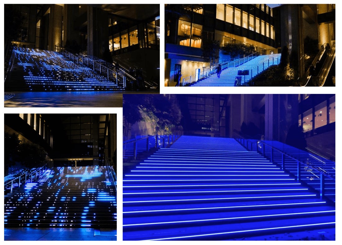 眩い輝きに包まれた光の大階段がストーリーのはじまりを彩ります。音楽とともに波を打つ青い光の動きが、躍動感溢れる煌めきを放ち、青いダイナミックな空間がこの先の光の世界へと誘います。