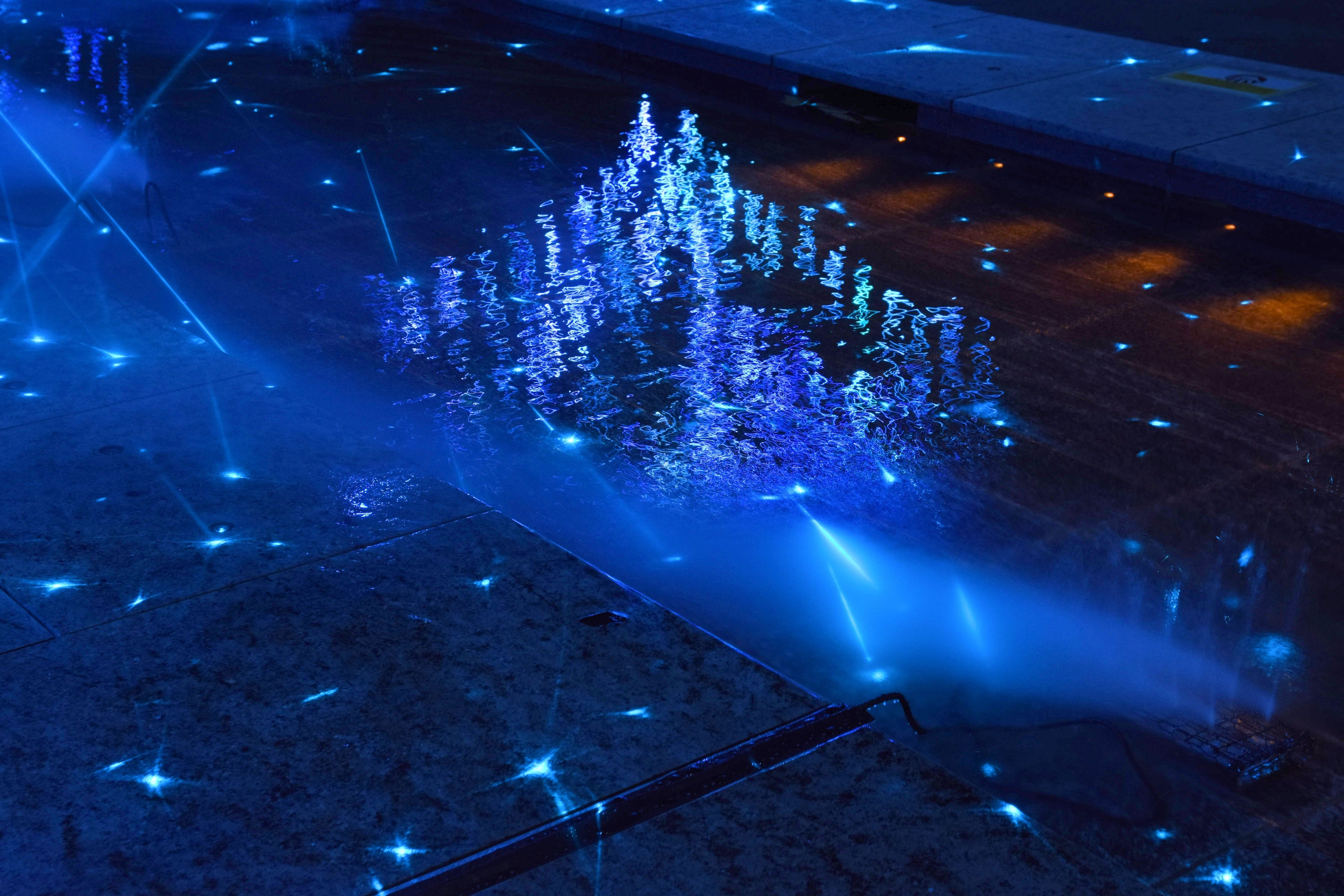 アトリウムの先では、夜空が一望できる開放的な空間が広がり、霧が立ち込める水面には木々から降り注ぐ光が青い結晶となって、穏やかに揺れる波模様と共にゆらめきます。光と水の幻想的なスペクタクルをお楽しみください。