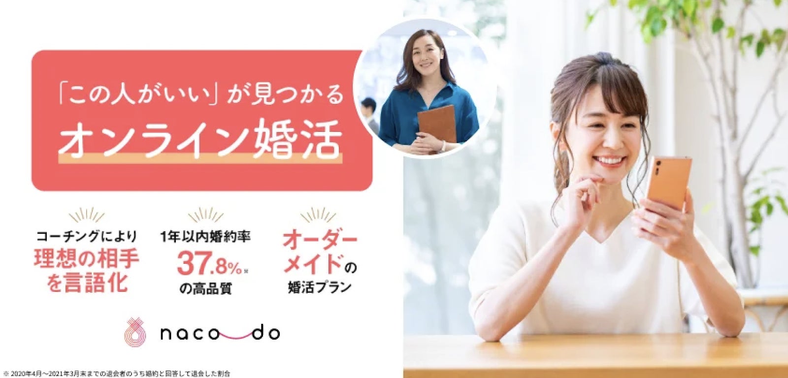 「naco-do」は、業界最大121,000人の会員数(*1)をもとにした出会いの提供だけでなく、独自のコーチングプログラムを修了した専属サポーターが出会いから結婚まで伴奏する婚活コーチングサービスを提供しています。100%独身証明書を取得している結婚したい独身同士が、サポートを受けながら結婚を目指せるため、アプリでの婚活と比較しても高い、1年以内の婚約率37.8%のサービス(*2)です。
