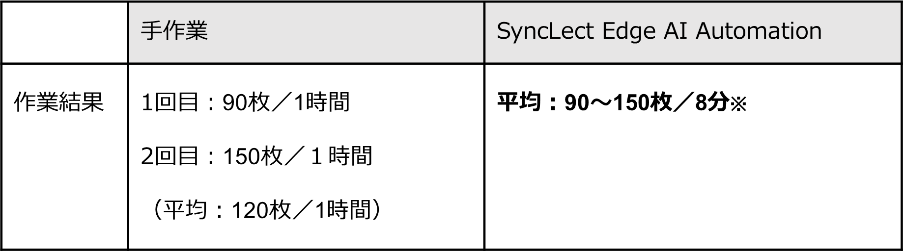 ※SyncLect Edge AI Automationでは、90枚と150枚の処理時間に大きな差は出ず、概ね8分となりました