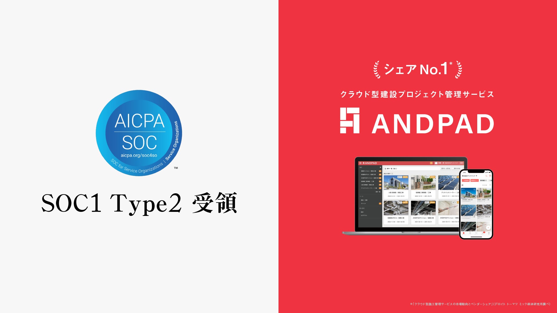 株式会社アンドパッド(本社:東京都千代田区、代表取締役:稲田武夫、以下アンドパッド)は、当社が提供するクラウド型建設プロジェクト管理サービス「ANDPAD」が、「SOC1 Type2報告書」を受領したことをお知らせいたします。