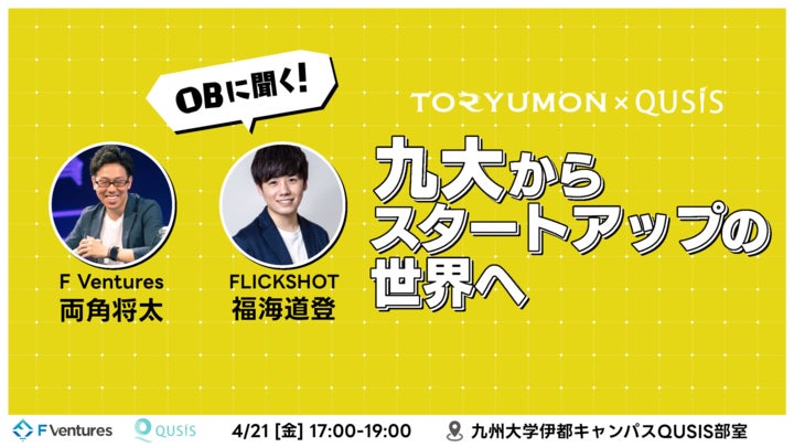 U25向けスタートアップイベント『TORYUMON』と九州大学起業部『QUSIS』の共催により、九州大学の新入生向けのスタートアップイベント『TORYUMON×QUSIS~OBに聞く「九大からスタートアップの世界へ」~』の開催が決定しました。F Ventures 両角将太、FLICKSHOT 福海道登 氏をお招きし、スタートアップの魅力や登壇者の学生時代の経験などを語っていただきます。