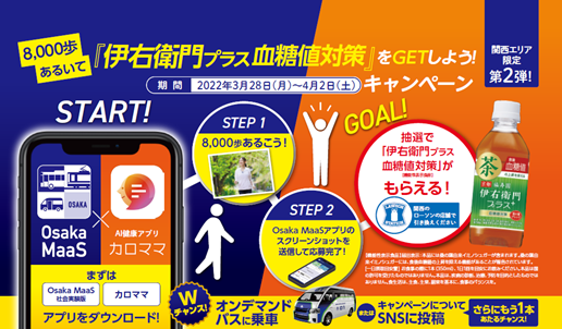 株式会社リンクアンドコミュニケーション(本社:東京都千代田区、代表取締役社長:渡辺 敏成、以下 当社)は、大阪市高速電気軌道株式会社(本社:大阪市西区、代表取締役 社長:河井英明、以下 Osaka Metro)、株式会社ローソン(本社:東京都品川区、代表取締役 社長:竹増 貞信、以下 ローソン)と合同で「Osaka Metro×AI健康アプリ「カロママ」合同キャンペーン!8,000歩あるいて伊右衛門プラス 血糖値対策(機能性表示食品) をGETしよう!」キャンペーンを開催します。