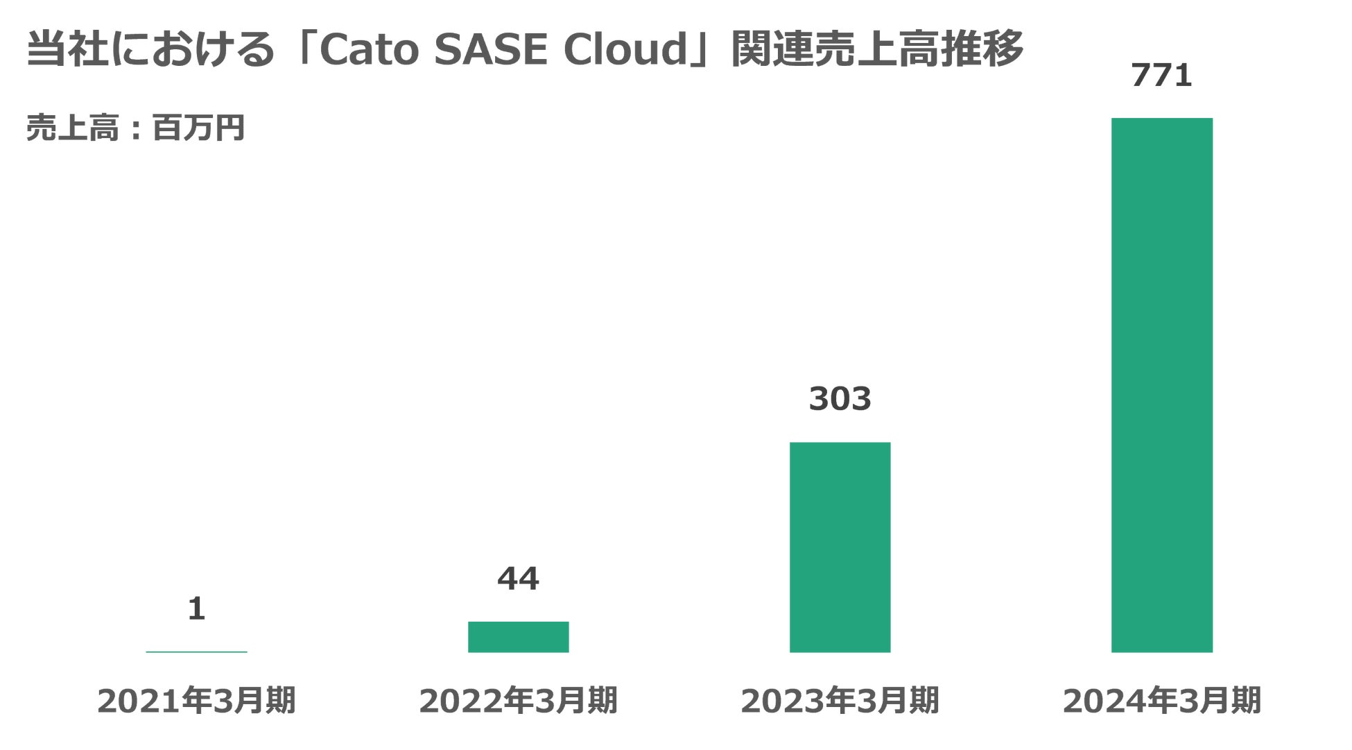 当社は、リセーラーパートナーとともに、国内での「Cato SASE Cloudプラットフォーム」導入企業を拡大し、関連売上高は2024年3月期において、前期比約2.5倍の771百万円となり、その成長は加速しております。