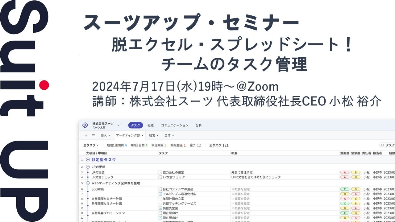 株式会社スーツ(所在地:東京都千代田区、代表取締役社長CEO:小松 裕介)は、2024年7月17日(水)19時から、当社代表の小松が講師を務めるスーツアップ・セミナー「脱エクセル・スプレッドシート!チームのタスク管理」を無料開催します。