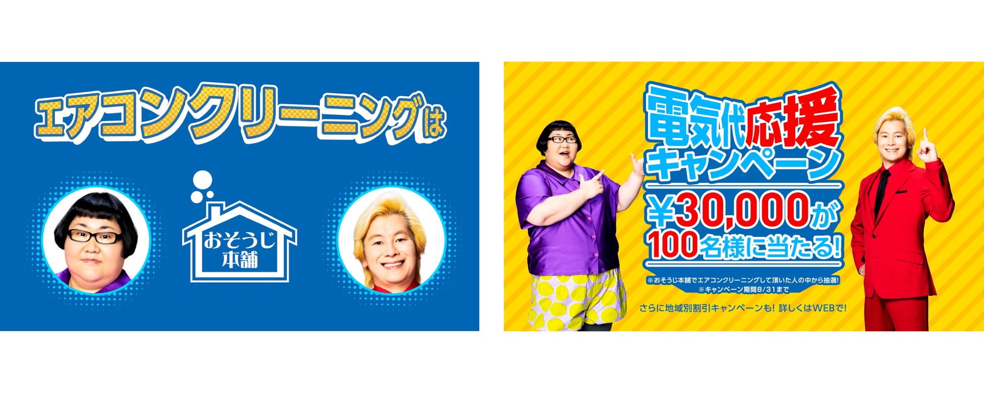 「おそうじ本舗」は昨年5月にメイプル超合金さんを起用したテレビCMを放映開始しました。このたびの新テレビCMでは、昨今家庭を悩ませている“電気代高騰”にフォーカスを当て、エアコン代の値上がりに苦しむメイプル超合金の安藤なつさんに、おそうじ本舗COOのカズレーザーさんがエアコンクリーニングとキャンペーンを紹介する設定で、テレビCMを展開していきます。