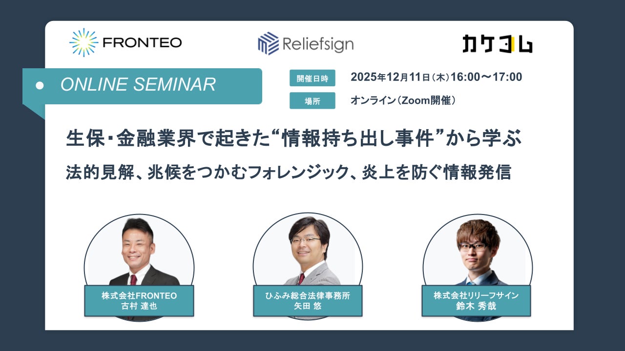 【FRONTEO・リリーフサイン・カケコム|共催セミナー開催】生保・金融業界で起きた“情報持ち出し事件”から学ぶ「法的見解」、「兆候をつかむフォレンジック」、「炎上を防ぐ情報発信」