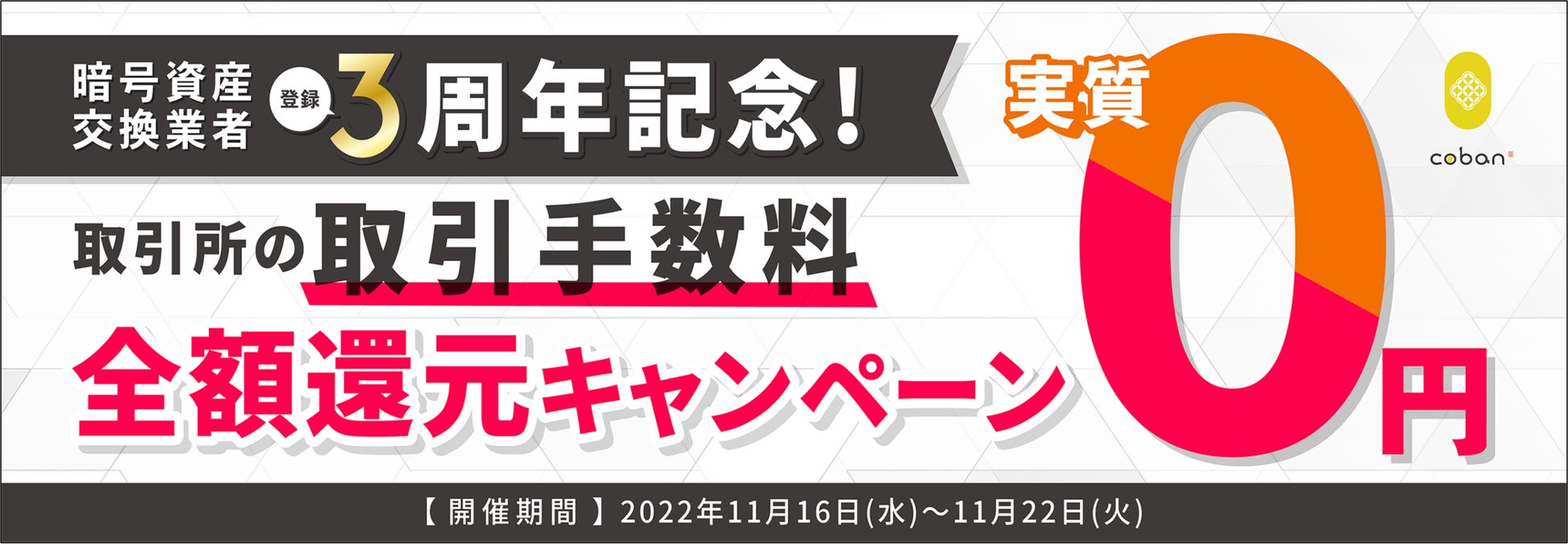 | 内容 | キャンペーン期間中に取引所にてお取引された方を対象に 取引手数料を全額c0banにて還元いたします。 |