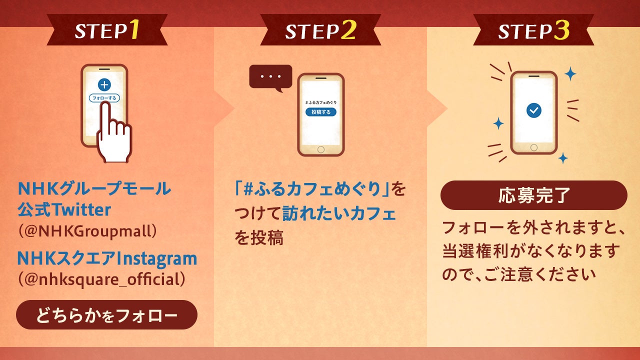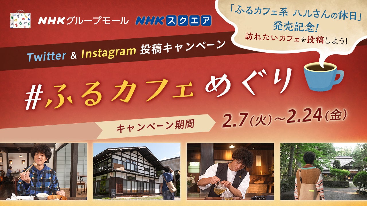「ふるカフェ系 ハルさんの休日」でハルさんが訪れたカフェの中から、行ってみたいカフェをハッシュタグ「#ふるカフェめぐり」をつけてSNSで投稿。投稿いただいた写真・内容は許諾をいただいたうえで、NHKグループモールのキャンペーンサイトにも掲載させていただきます。