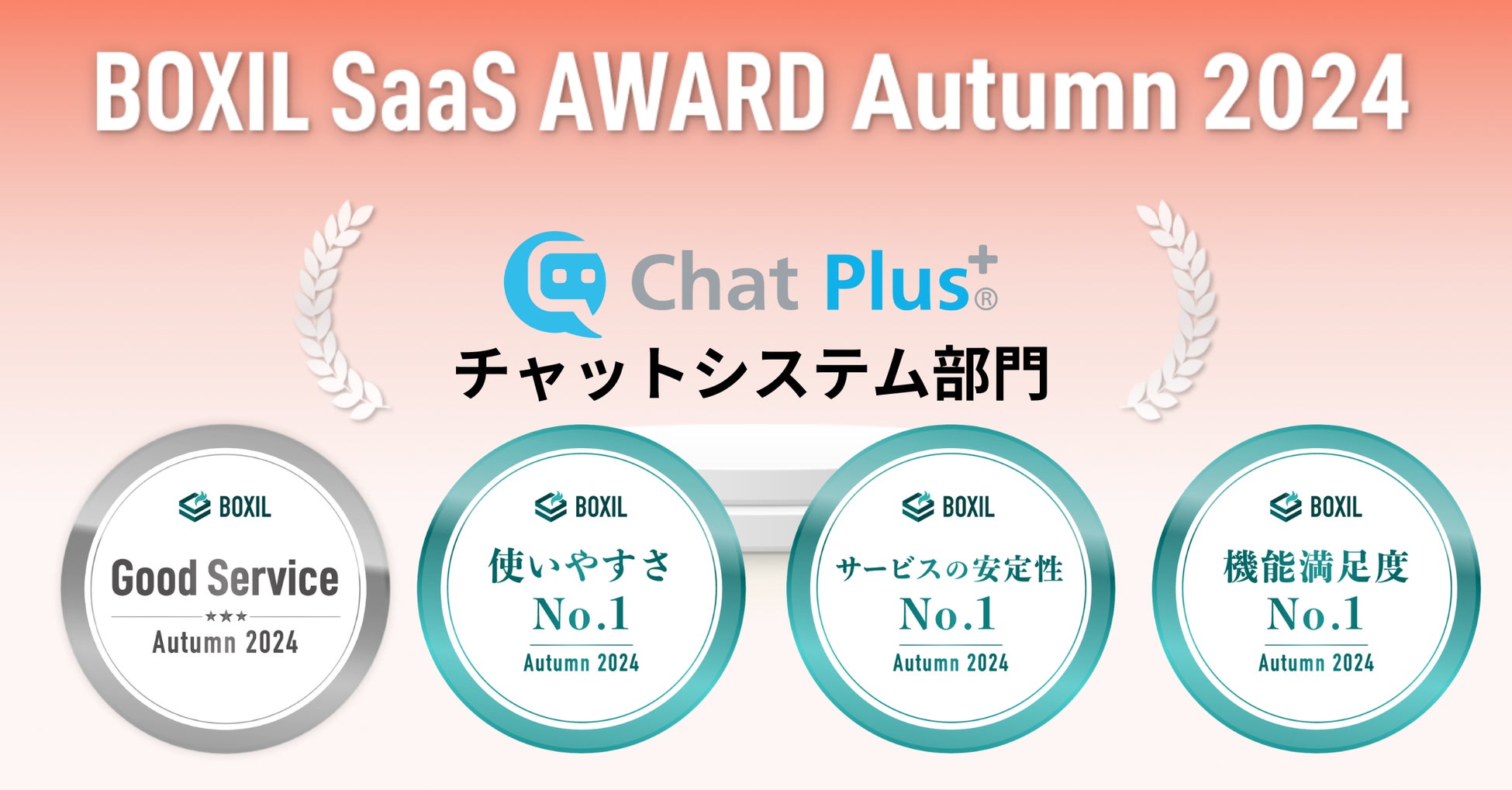 「ChatPlus(チャットプラス)」は、「BOXIL SaaS AWARD Autumn 2024」のチャットシステム部門において「Good Service」、「使いやすさNo.1」、「機能満足度No.1」、「サービスの安定性No.1」に選出されました。