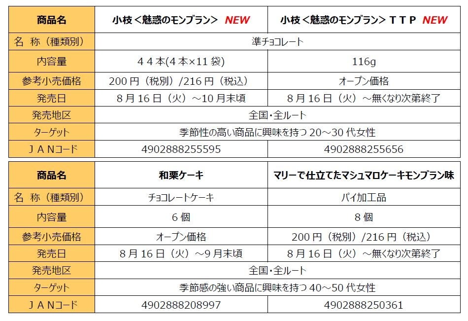 森永製菓株式会社(東京都港区芝、代表取締役社長・太田 栄二郎)は、秋の味わいを楽しめる「小枝<魅惑のモンブラン>」、「和栗ケーキ」、「マリーで仕立てたマシュマロケーキモンブラン味」を8月16日(火)から期間限定で発売いたします。