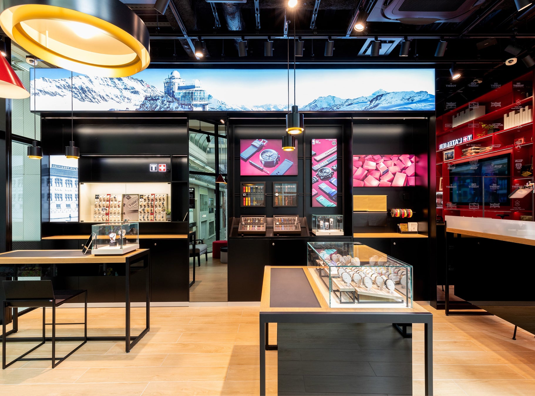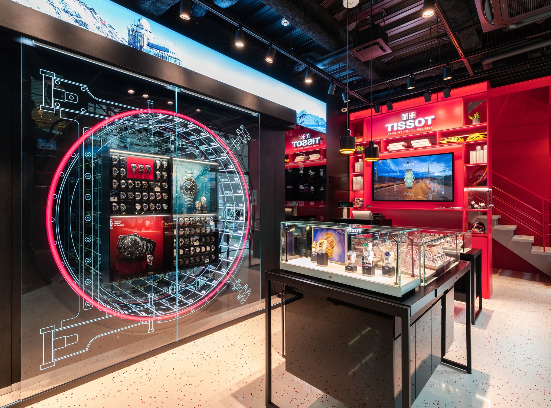 ティソ レッド ウォール:建物で一番目を引くのは、ブティックの外からも見える真っ赤なウォール。ティソのブランドカラーである赤を基調にした棚がつくりつけられており、1階にはスポーツ、2階にはヘリテージとティソブランドを象徴するアイテムによるデコレーションが施されています。