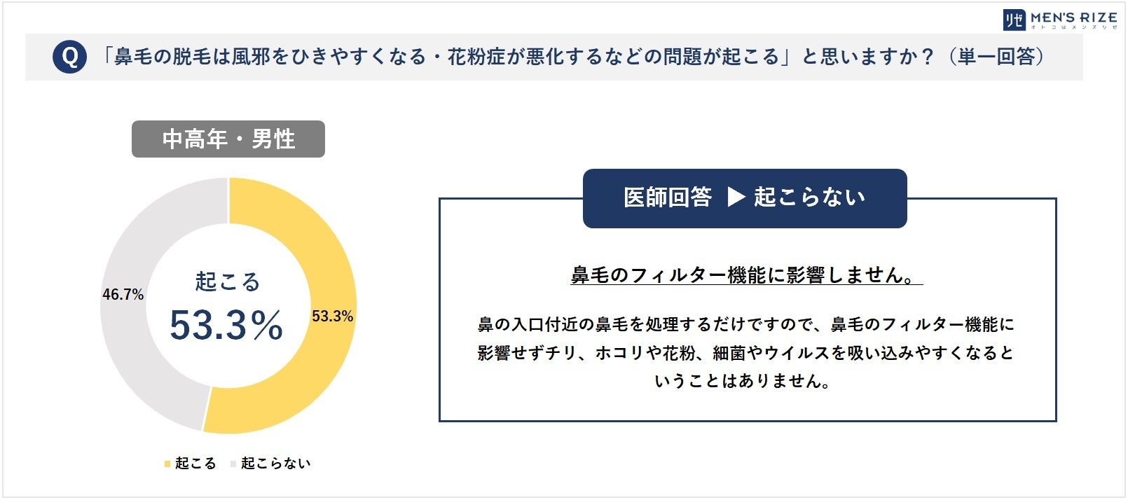 - ◆⑥【「鼻毛の脱毛」で風邪をひきやすくなる・花粉症が悪化する、などの問題が起こる】⇒ 一般回答:起こる(53.3%)/ 医師回答:起こらない
