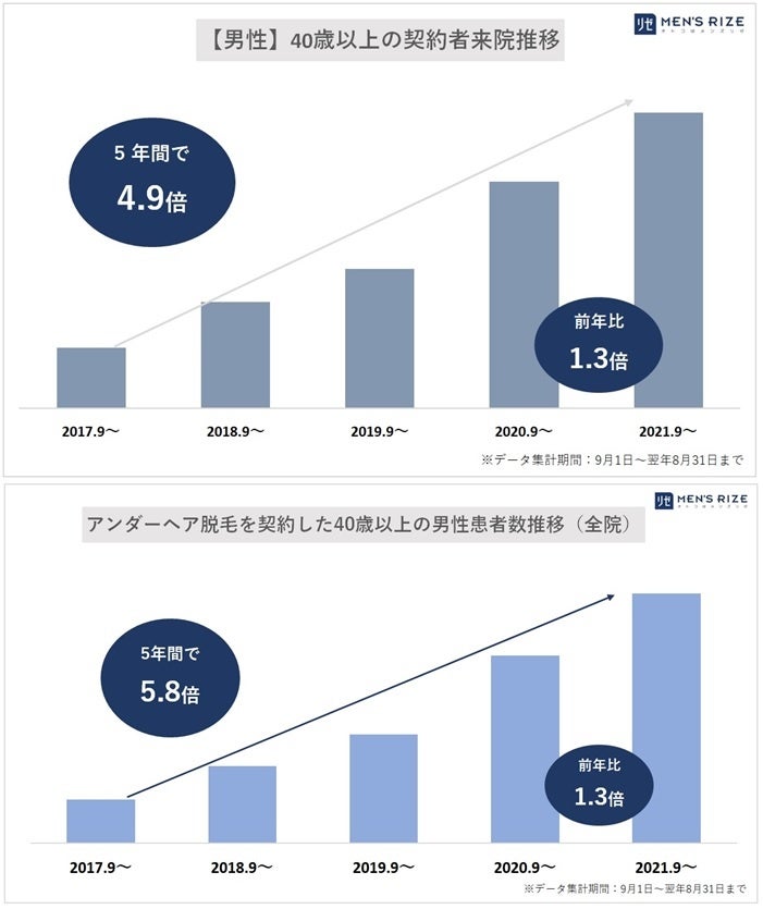 また当院の「人気脱毛部位(①ヒゲ脱毛 ②全身脱毛 ③VIO脱毛)」では3位にランクインし、近年「介護脱毛」としても注目される【「アンダーヘア脱毛」を契約した40歳以上の男性患者数】を5年前と比較すると、「5.8倍増(前年比:1.3倍)」に。(※ 5年前の「2017年9月1日~2018年8月31日までの1年間」と、今期「2021年9月1日~2022年8月31日までの1年間」を比較)