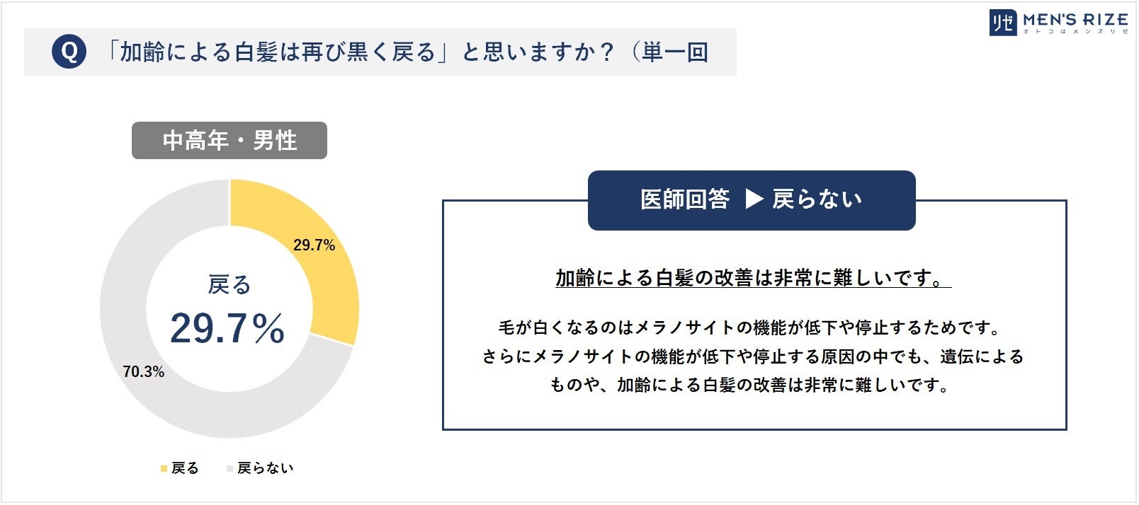 - ◆③【加齢による白髪は再び黒く戻る】⇒ 一般回答:戻る(29.7%)/ 医師回答:戻らない
