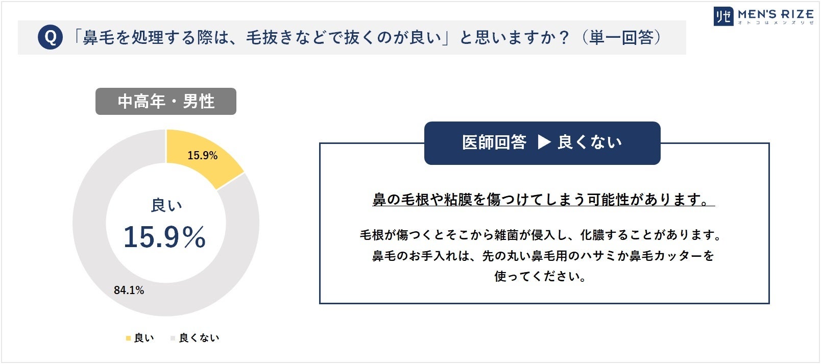 - ◆⑤【鼻毛を処理する際は、毛抜きなどで「抜くのが良い」】⇒ 一般回答:良い(15.9%)/ 医師回答:良くない