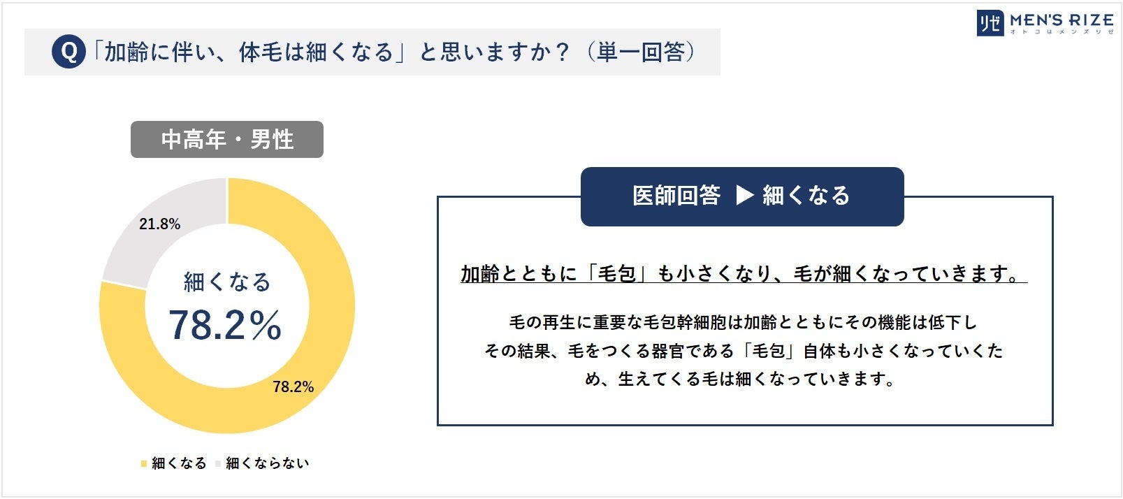 - ◆④【加齢に伴い、体毛は細くなる】⇒ 一般回答:細くなる(78.2%)/ 医師回答:細くなる