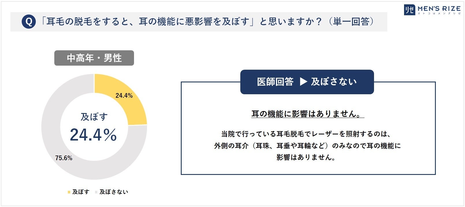 - ◆⑦【耳毛の脱毛をすると、耳の機能に悪影響を及ぼす】⇒ 一般回答:及ぼす(24.4%)/ 医師回答:及ぼさない