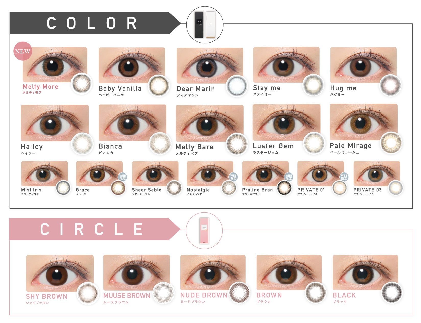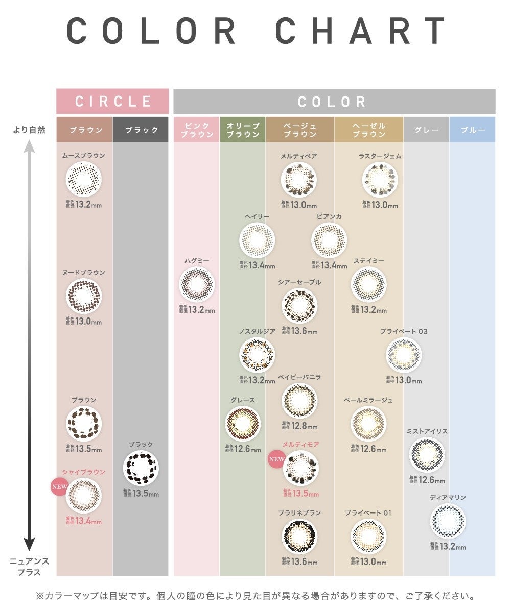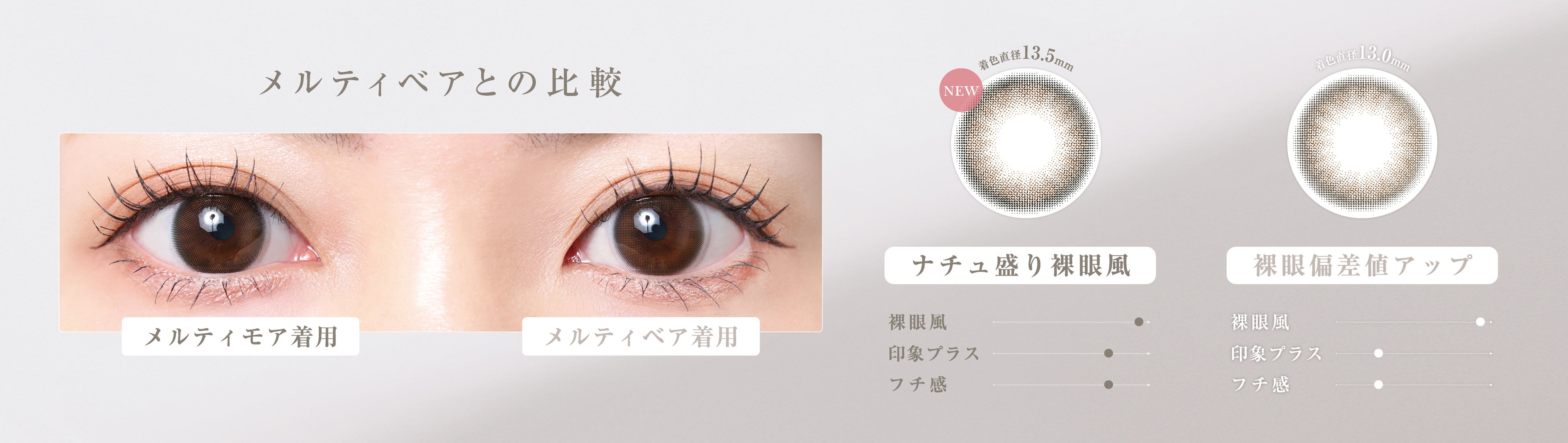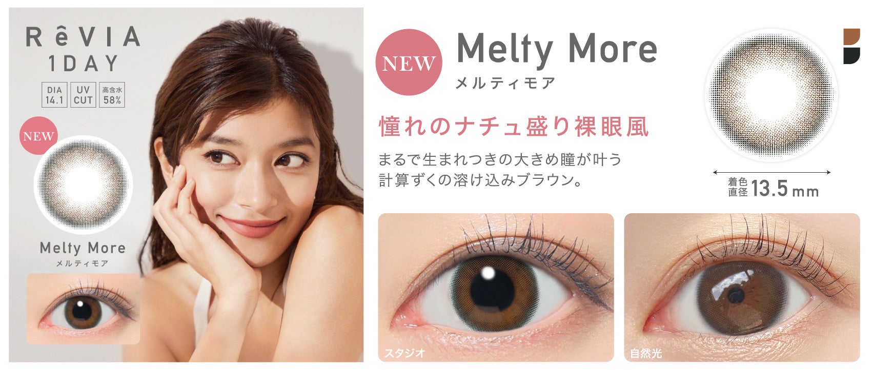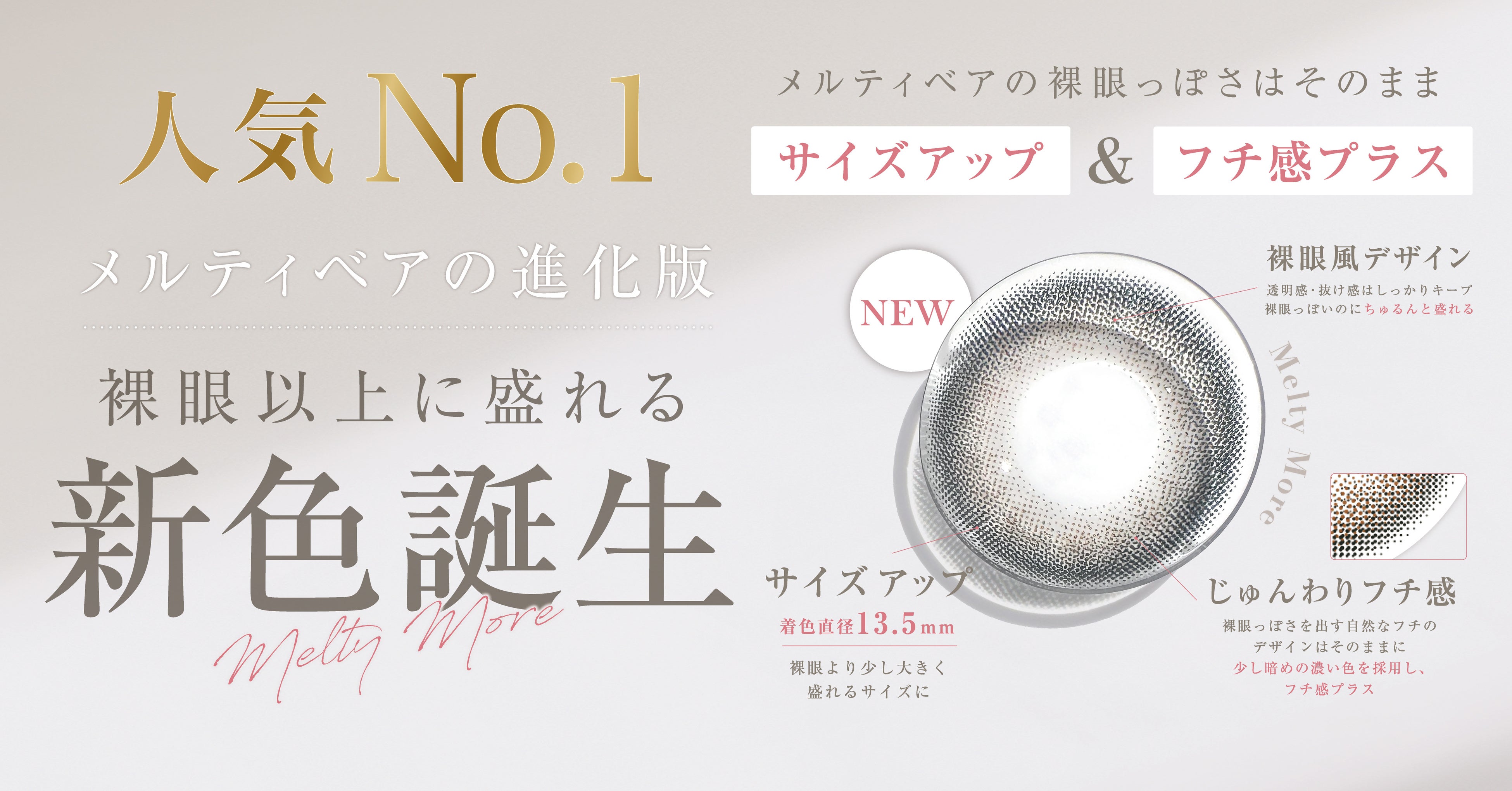 裸眼偏差値アップカラコンとしてReVIAで不動の人気NO.1を誇るメルティベアの進化版“メルティモア”が新色として誕生。メルティベアの裸眼っぽさはそのままに、着色直径のサイズアップとフチ感をプラスして、“裸眼以上に盛れる”進化版デザインとなります。
