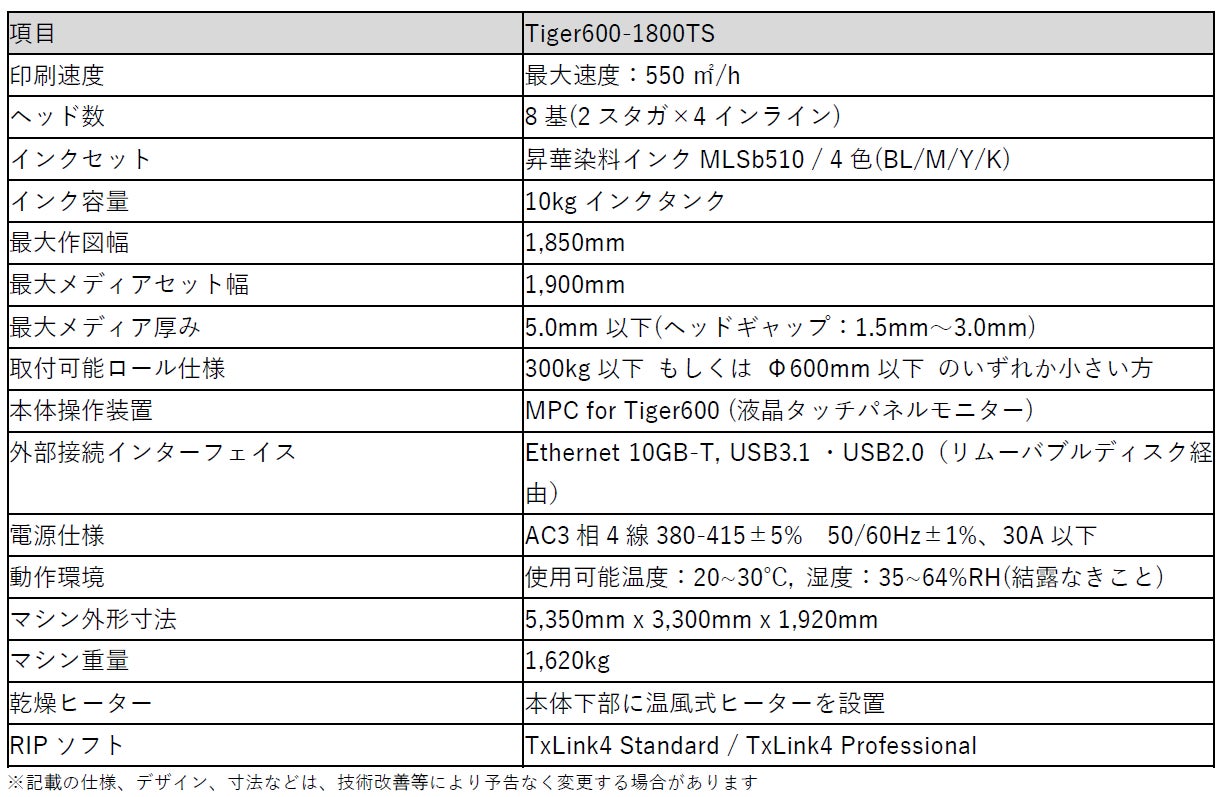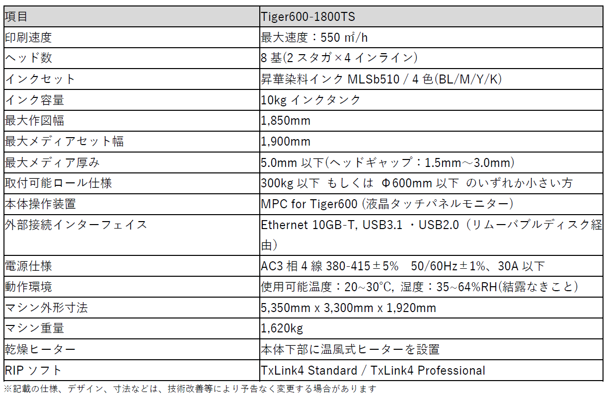アナログ捺染のデジタル化を推進する生産性当社最速の昇華転写用プリンタ「Tiger600-1800TS」を発表