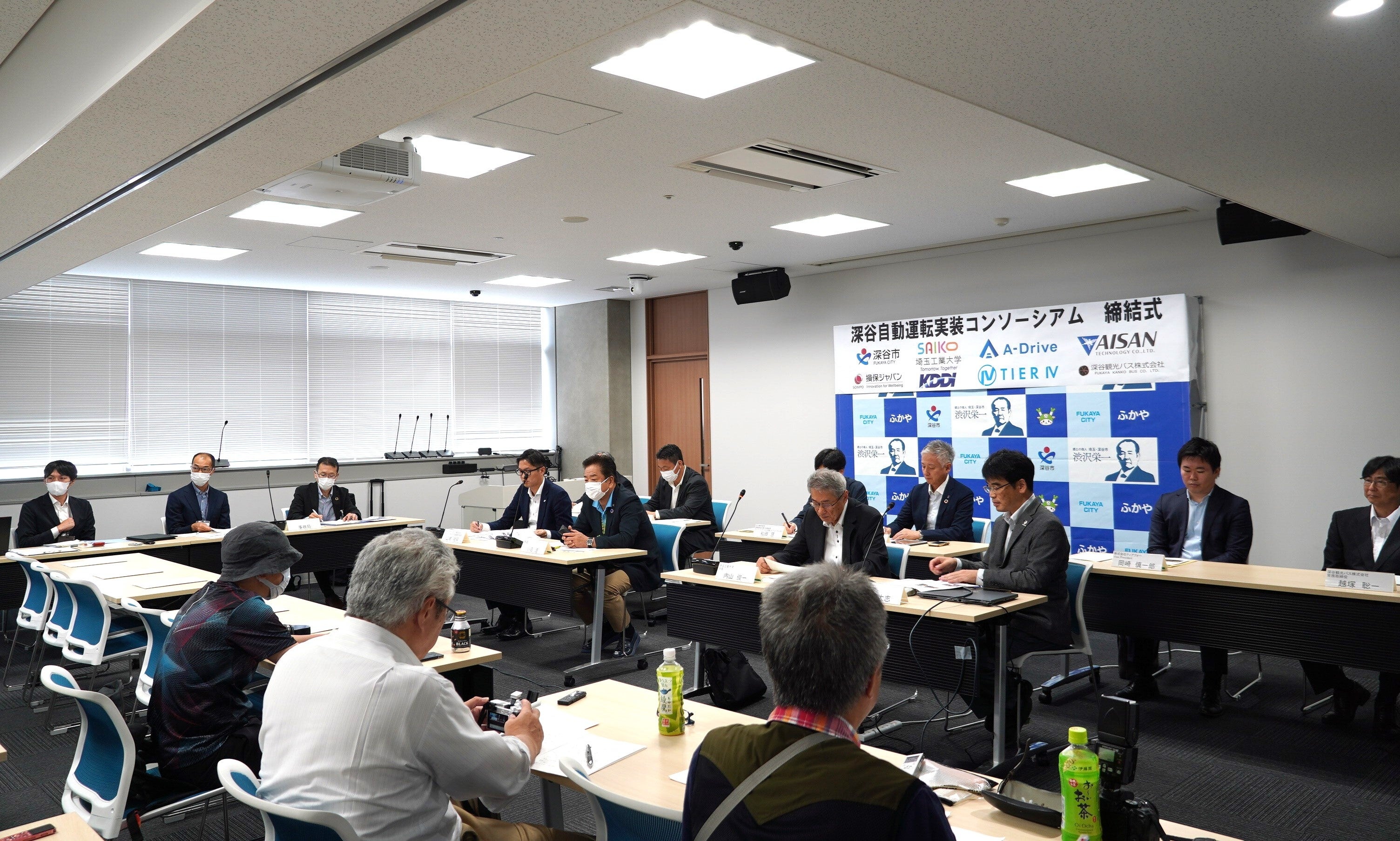 深谷市では、市内公共交通における運転手不足や運転手の高齢化といった問題が大変深刻化しており、将来的な公共交通の維持・確保が重要な課題であると考えております。そのような中で、地元大学である埼玉工業大学様よりお声掛けいただき、自動運転分野の専門技術を有する7つの事業者の皆様とコンソーシアムを結成し、『産学官連携』で地域公共交通への自動運転技術の導入を目指す取組みを推進することといたしました。