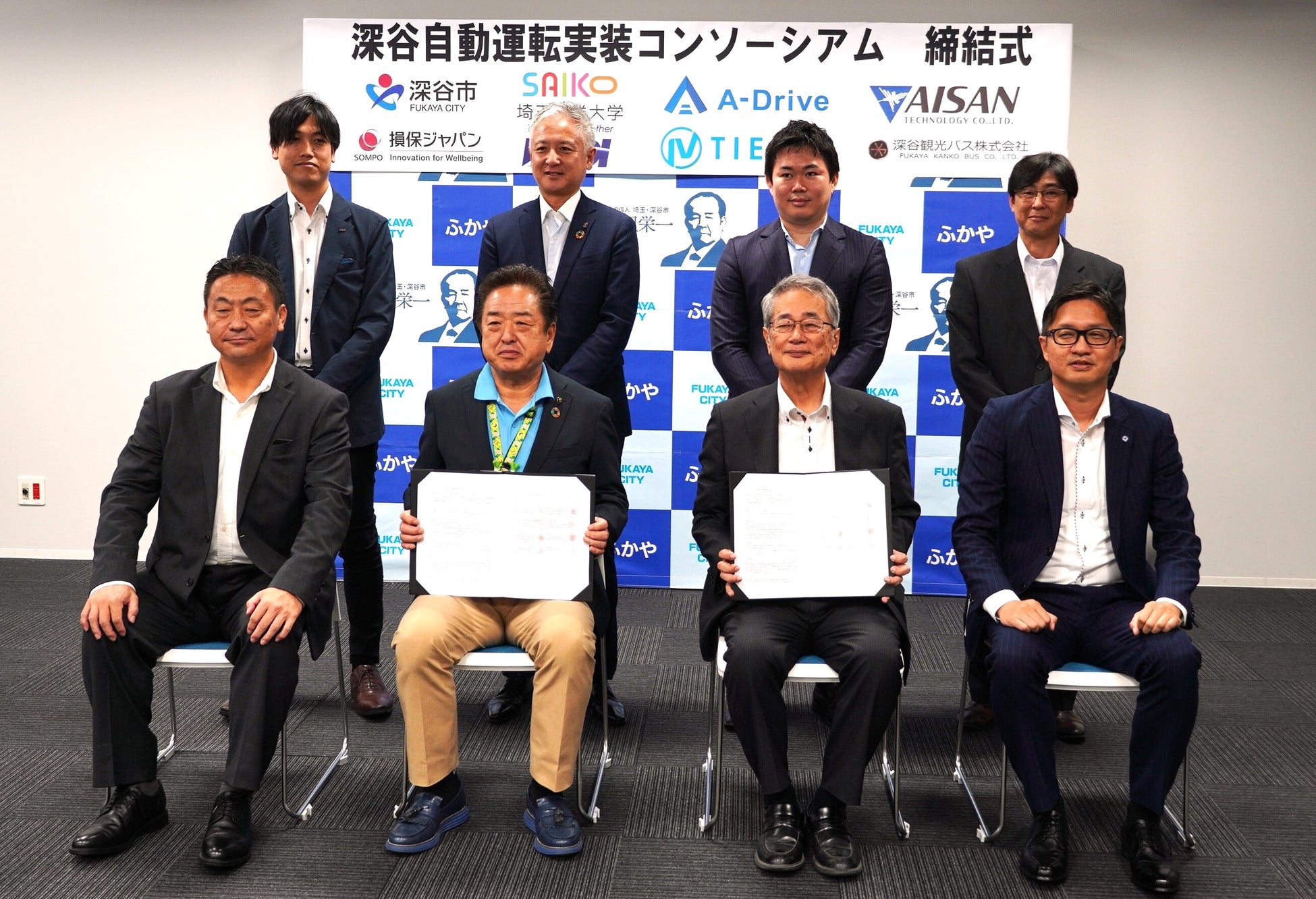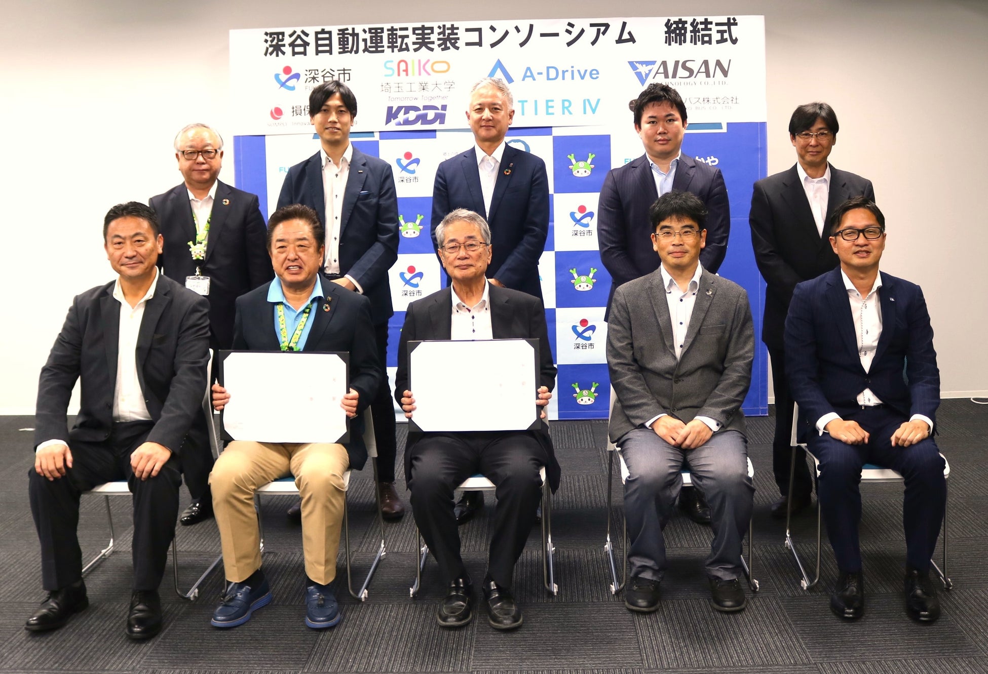 深谷市(市長:小島 進)、埼玉工業大学(本部:埼玉県深谷市、学長:内山 俊一)、A-Drive株式会社(本社:神奈川県横浜市、代表取締役社長:岡部 定勝)、アイサンテクノロジー株式会社(本社:愛知県名古屋市、代表取締役社長:加藤 淳)、損害保険ジャパン株式会社(本社:東京都新宿区、代表取締役社長:白川 儀一)、KDDI株式会社(本社:東京都千代田区、代表取締役社長:髙橋 誠)、株式会社ティアフォー(本社:愛知県名古屋市、代表取締役社長:加藤 真平)、 深谷観光バス株式会社 (本社:埼玉県深谷市、代表取締役:髙田 勇三)は、『深谷自動運転実装コンソーシアム』の連携協定を、令和5年6月27日に締結しました。
