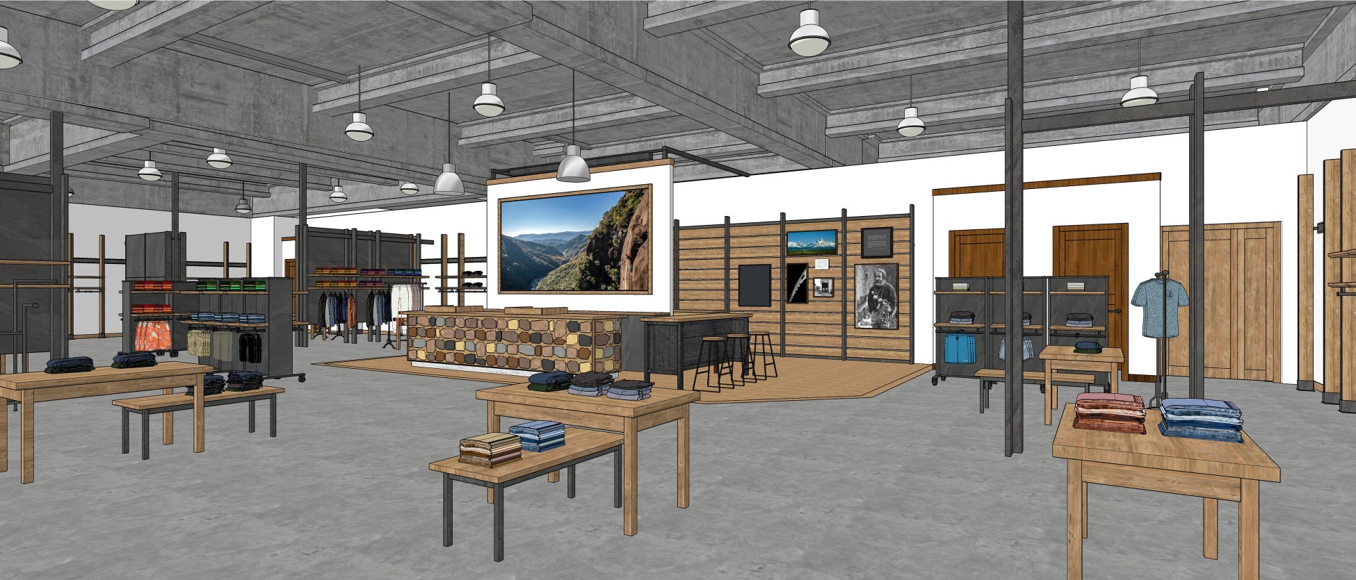 直営店で初めてとなる店内の試みとして、九州の美しい自然や各地域で起こっている課題、アウトドアアクティビティをこよなく愛する人々のストーリーを随所にレイアウトしました。幅広い製品ラインナップと共にご覧いただける心地よい空間づくりを実現、約100坪の売り場は特別展示ギャラリーとシアター上映も可能なイベントスペースを兼ね備えています。