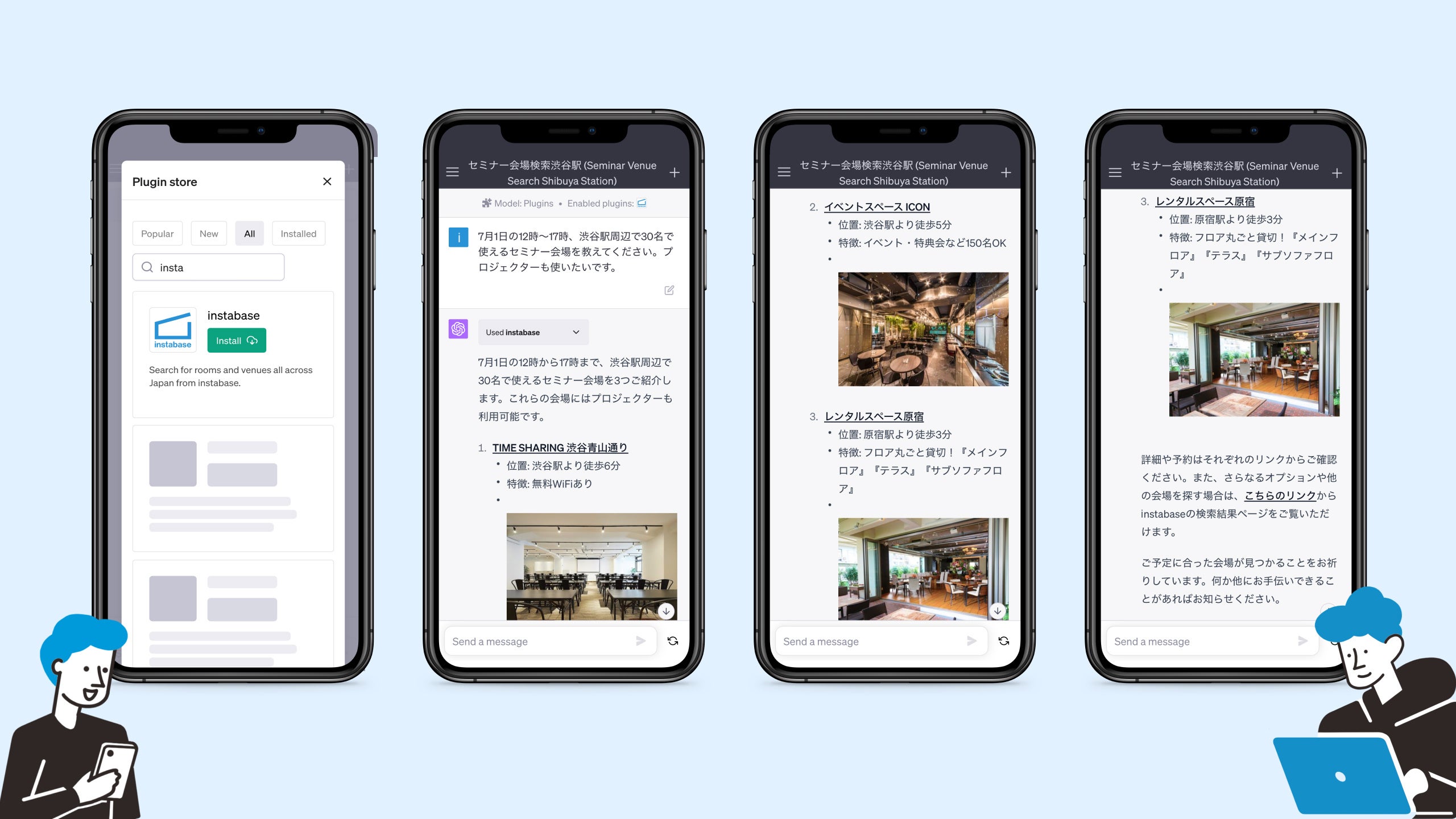 そのような中、今回は「場所を探している人」が、自分で検索・大量の情報の中から吟味しなくとも、「インスタベースChatGPTプラグイン」を利用することで、より早く・簡単に最適なスペースを見つける・出会うことを可能にします。