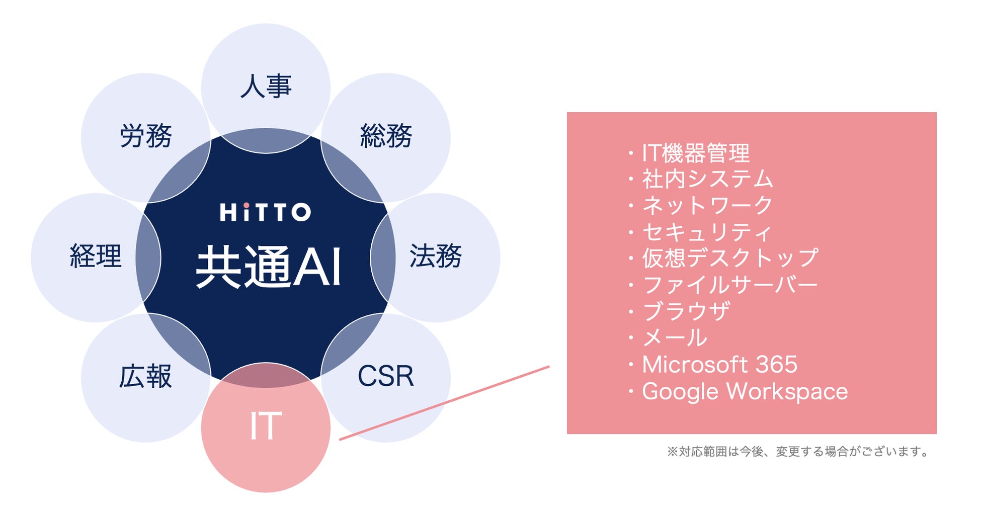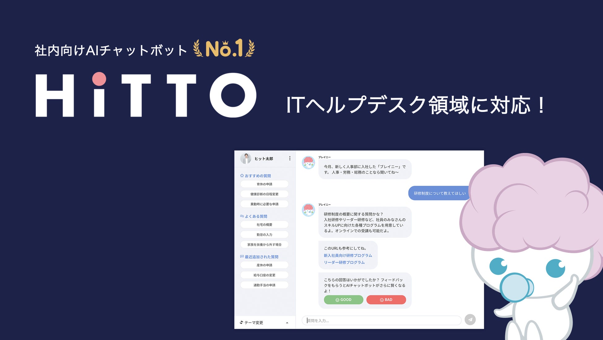 HiTTO株式会社(本社:東京都千代田区、代表取締役:五十嵐 智博、木村 彰人、以下 「弊社」)は、社内向けAIチャットボット「HiTTO」に搭載しているバックオフィス領域に特化した共通AIが、新たに「ITヘルプデスク」の領域に対応したことを発表いたします。