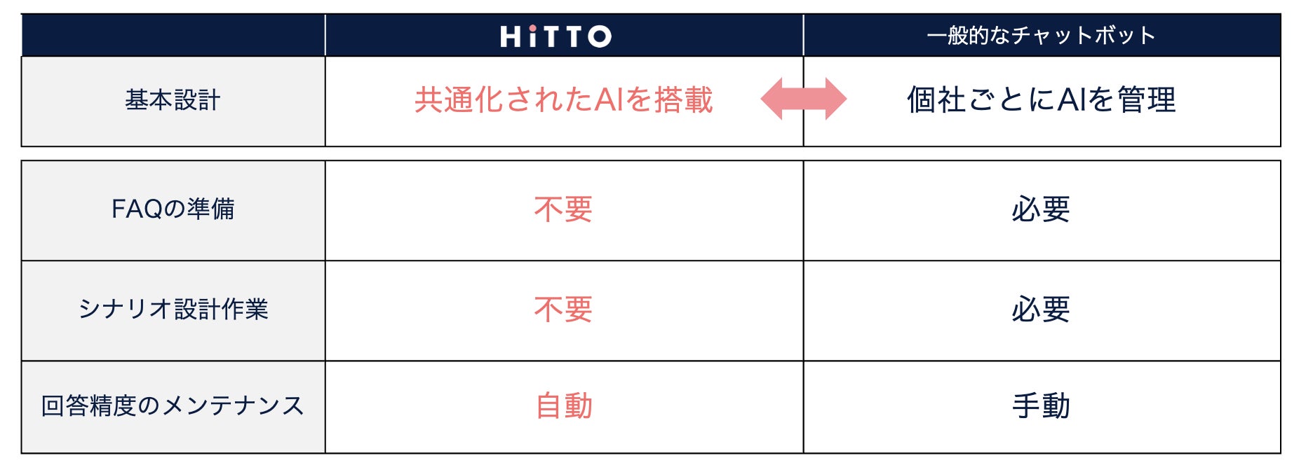 HiTTOの最大の特長は、社内DXに特化したAIチャットボットであることです。HiTTOは、日本中のバックオフィス部門のナレッジを体系化した1,000件以上の回答データベースと従業員からバックオフィスに届く一般的な質問パターンを100万件以上学習した共通AIを搭載しています。これにより、導入企業様は一般的なAIチャットボットの運用で必要となる、FAQデータの作成やシナリオ設計、回答精度を維持するためのAIのチューニングなど、個別で一から学習データを作成することなく、高精度なAIチャットボットをご利用いただくことができます。
