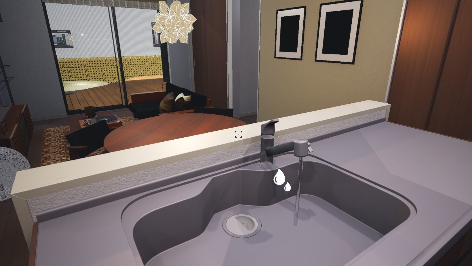 これまでのVRは360度パノラマラウンド型であったのに対し、今回のバーチャルモデルハウスは自由に動き回ることが可能となっています。「Unreal Engine(アンリアル エンジン)」を使用し、これまでゲームの世界では可能であった自由な動きを踏襲することによって、自由に歩き回り、電気をつける、蛇口から水を出す、コンロの火を点火するなどのリアルな住宅見学での体験を再現しました。現実空間での制約から自由になれるだけでなく、「自分らしい暮らし方」を疑似体験しながら家づくりができるようになります。