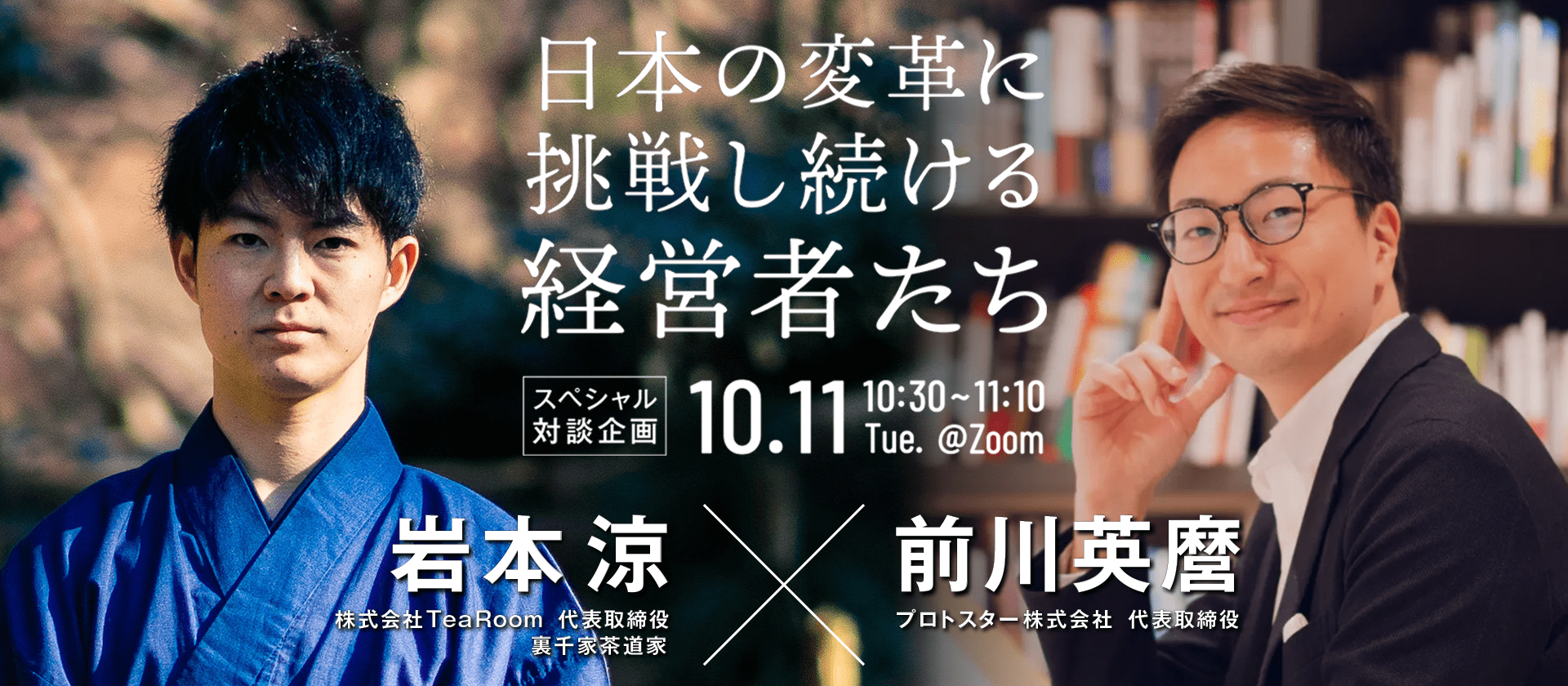 「Forbes JAPAN 30 UNDER 30 2022」に選出、ダボス会議グローバルシェイパーズのメンバーなどのご経歴がある株式会社TeaRoom 代表取締役の岩本涼氏をお招きし、弊社代表前川が会社のことや岩本氏本人についてなど挑戦する経営者の特徴などを深堀していく対談形式のイベントになります。