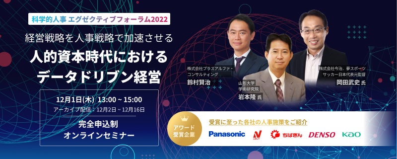 また、「科学的人事 エグゼクティブフォーラム2022」では、本アワードの発表に加え山形大学学術研究院 岩本氏やサッカー日本代表元監督 岡田氏の特別講演を実施いたしました。12月1日にイベントをオンライン配信いたしますので、ご興味がある方はぜひお申し込みください。