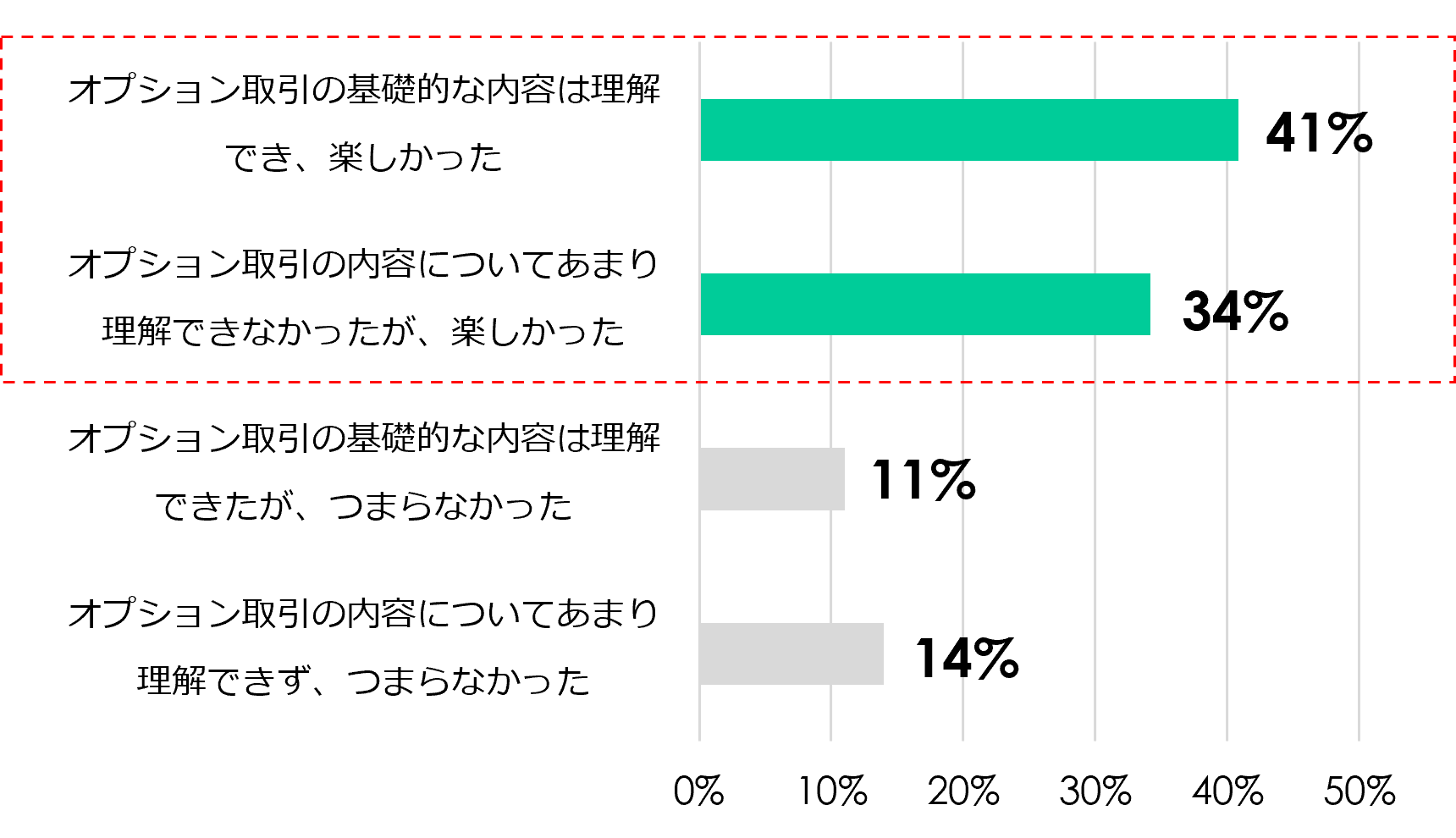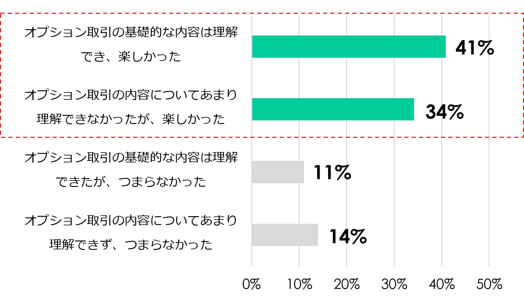 参加者の8割以上がオプション取引初体験の中、全体の5割を超える方がオプション取引に興味を持ち、取引をしてみたいと感じて頂けたのは、ポイント運用だったからこその安心感もあったのではないかと思います。